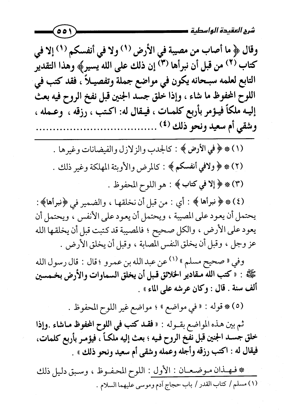 ثم بين هذه المواضع بقوله: «فقد كتب في اللوح المحفوظ ما شاء. وإذا خلق جسد الجنين قبل نفخ الروح فيه؛ بعث إليه ملكا، فيؤمر بأربع كلمات، فيقال له: اكتب رزقه وأجله وعمله وشقي أم سعيد ونحو ذلك» .