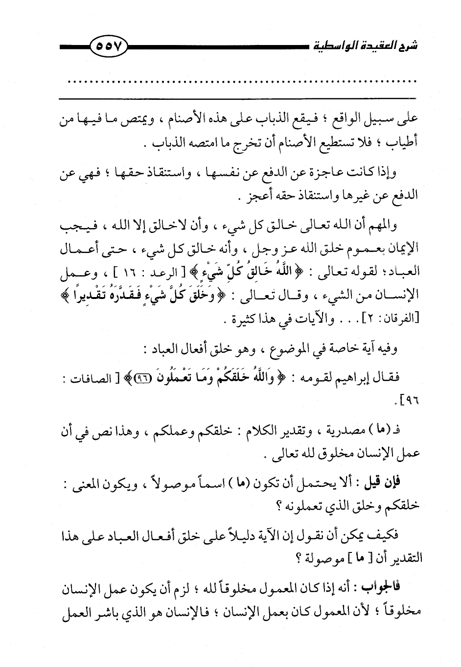 فالجواب: أنه إذا كان المعمول مخلوقا لله؛ لزم أن يكون عمل الإنسان مخلوقا؛ لأن المعمول كان بعمل الإنسان؛ فالإنسان هو الذي باشر العمل