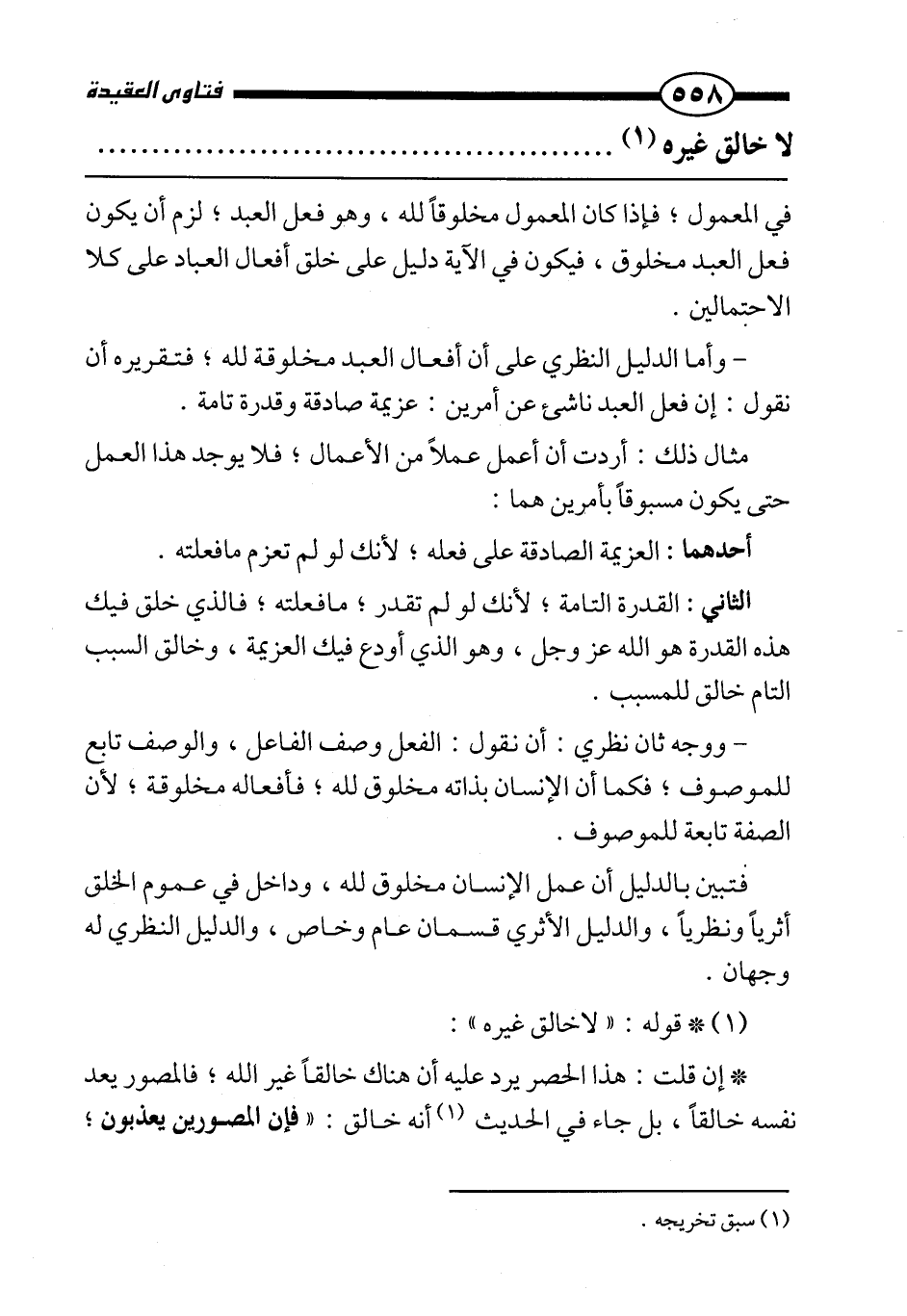 الثاني: القدرة التامة؛ لأنك لو لم تقدر؛ ما فعلته؛ فالذي خلق فيك هذه القدرة هو الله عز وجل، وهو الذي أودع فيك العزيمة، وخالق السبب التام خالق للمسبب.
