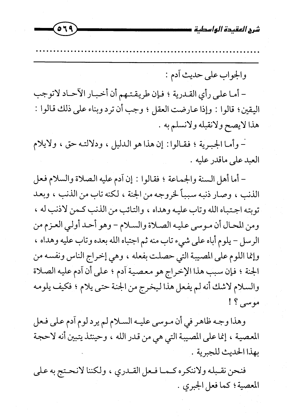 وهذا وجه ظاهر في أن موسى عليه السلام لم يرد لوم آدم على فعل المعصية، إنما على المصيبة التي هي من قدر الله، وحينئذ يتبين أنه لا حجة بهذا الحديث للجبرية.