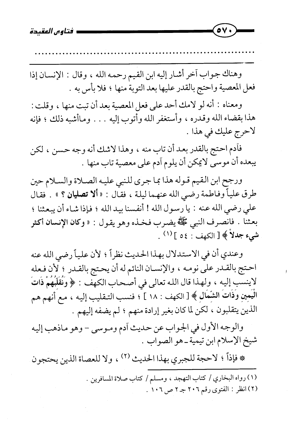 ورجح ابن القيم قوله هذا بما «جرى للنبي عليه الصلاة والسلام حين طرق عليا وفاطمة رضي الله عنهما ليلة، فقال: " ألا تصليان؟ ". فقال علي رضي الله عنه: يا رسول الله! أنفسنا بيد الله؛ فإذا شاء أن يبعثنا؛ بعثنا. فانصرف النبي صَلَّى اللَّهُ عَلَيْهِ وَسَلَّمَ يضرب فخذه وهو يقول: {وَكَانَ الْإِنْسَانُ أَكْثَرَ شَيْءٍ جَدَلًا} [الكهف: 54] » .