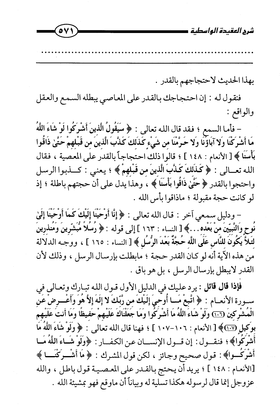ودليل سمعي آخر: قال الله تعالى: {إِنَّا أَوْحَيْنَا إِلَيْكَ كَمَا أَوْحَيْنَا إِلَى نُوحٍ وَالنَّبِيِّينَ مِنْ بَعْدِهِ} [النساء:163] إلى قوله: {رُسُلًا مُبَشِّرِينَ وَمُنْذِرِينَ لِئَلَّا يَكُونَ لِلنَّاسِ عَلَى اللَّهِ حُجَّةٌ بَعْدَ الرُّسُلِ} [النساء:165] ، ووجه الدلالة من هذه الآية أنه لو كان القدر حجة؛ ما بطلت بإرسال الرسل، وذلك لأن القدر لا يبطل بإرسال الرسل، بل هو باق.