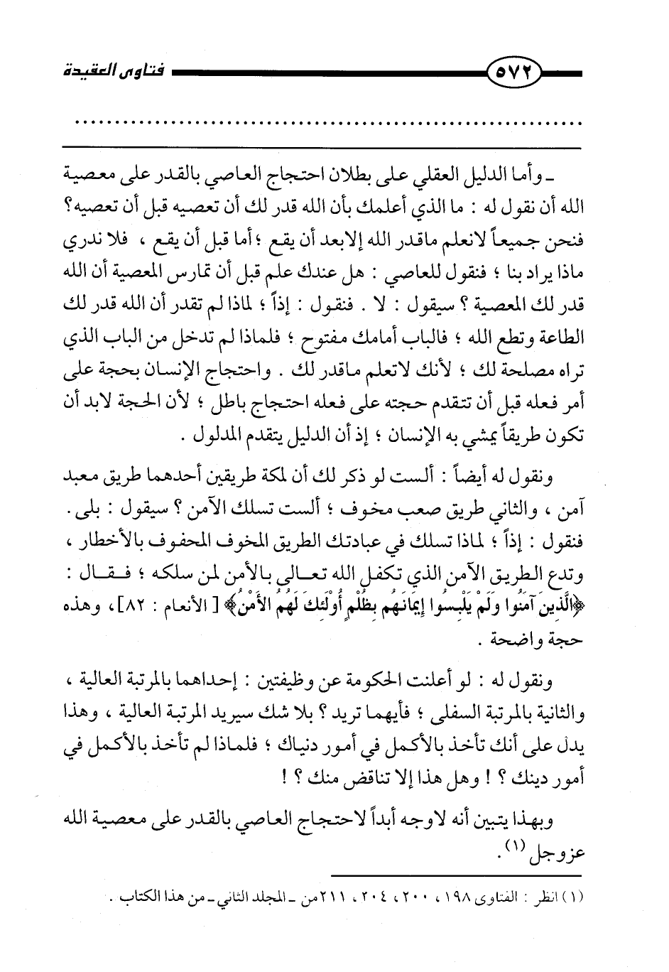وأما الدليل العقلي على بطلان احتجاج العاصي بالقدر على معصية الله أن نقول له: ما الذي أعلمك بأن الله قدر لك أن تعصيه قبل أن تعصيه؟ فنحن جميعا لا نعلم ما قدر الله إلا بعد أن يقع؛ أما قبل أن يقع، فلا ندري ماذا يراد بنا؛ فنقول للعاصي: هل عندك علم قبل أن تمارس المعصية أن الله قدر لك المعصية؟ سيقول: لا. فنقول: إذا؛ لماذا لم تقدر أن الله قدر لك الطاعة وتطع الله؛ فالباب أمامك مفتوح، فلماذا لم تدخل من الباب الذي تراه مصلحة لك؛ لأنك لا تعلم ما قدر لك. واحتجاج الإنسان بحجة على أمر فعله قبل أن تتقدم حجته على فعله احتجاج باطل؛ لأن الحجة لا بد أن تكون طريقا يمشي به الإنسان؛ إذ أن الدليل يتقدم المدلول.