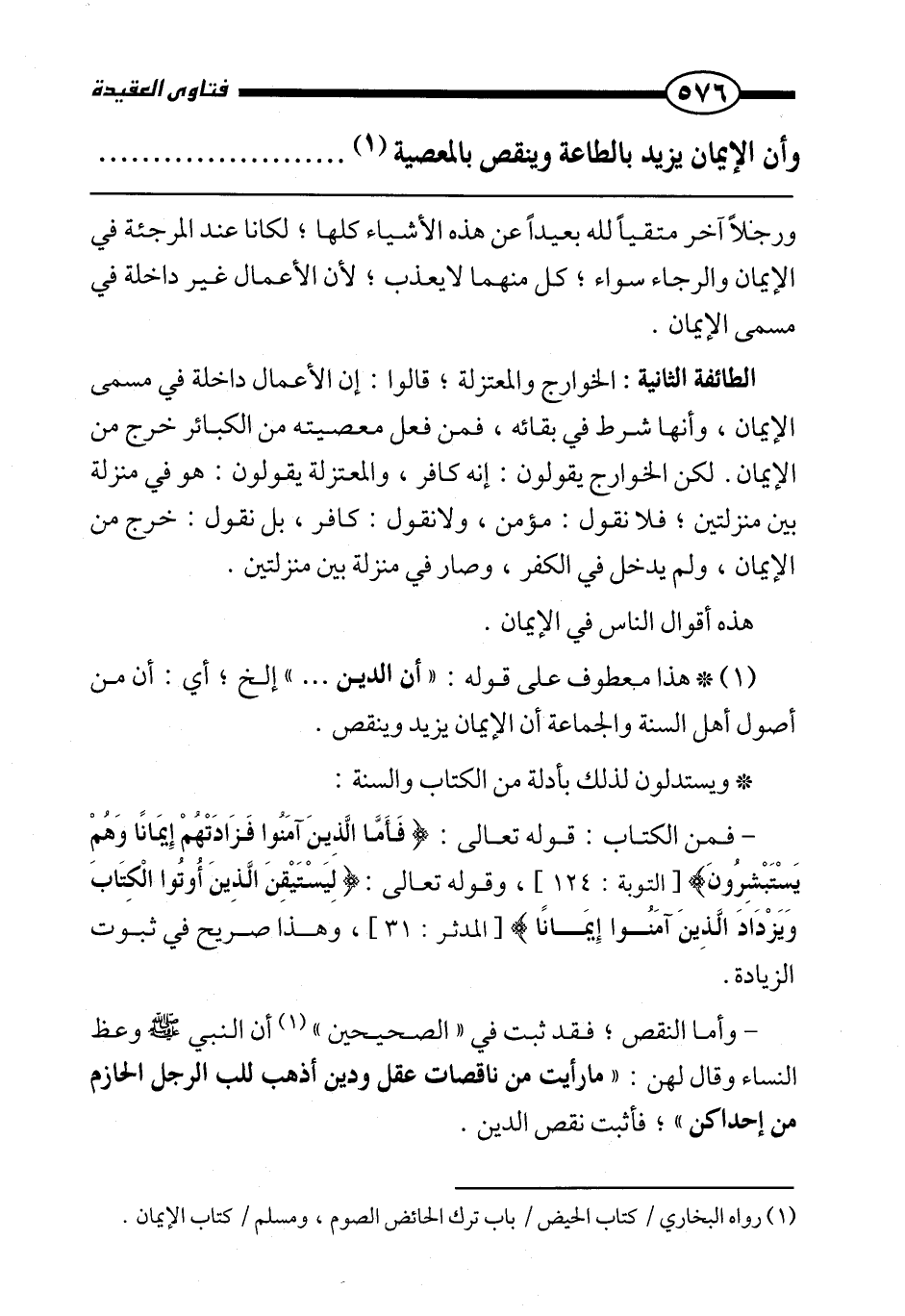 وأما النقص؛ فقد ثبت في " الصحيحين «أن النبي صَلَّى اللَّهُ عَلَيْهِ وَسَلَّمَ وعظ النساء وقال لهن: " ما رأيت من ناقصات عقل ودين أذهب للب الرجل الحازم من إحداكن» ؛ فأثبت نقص الدين.