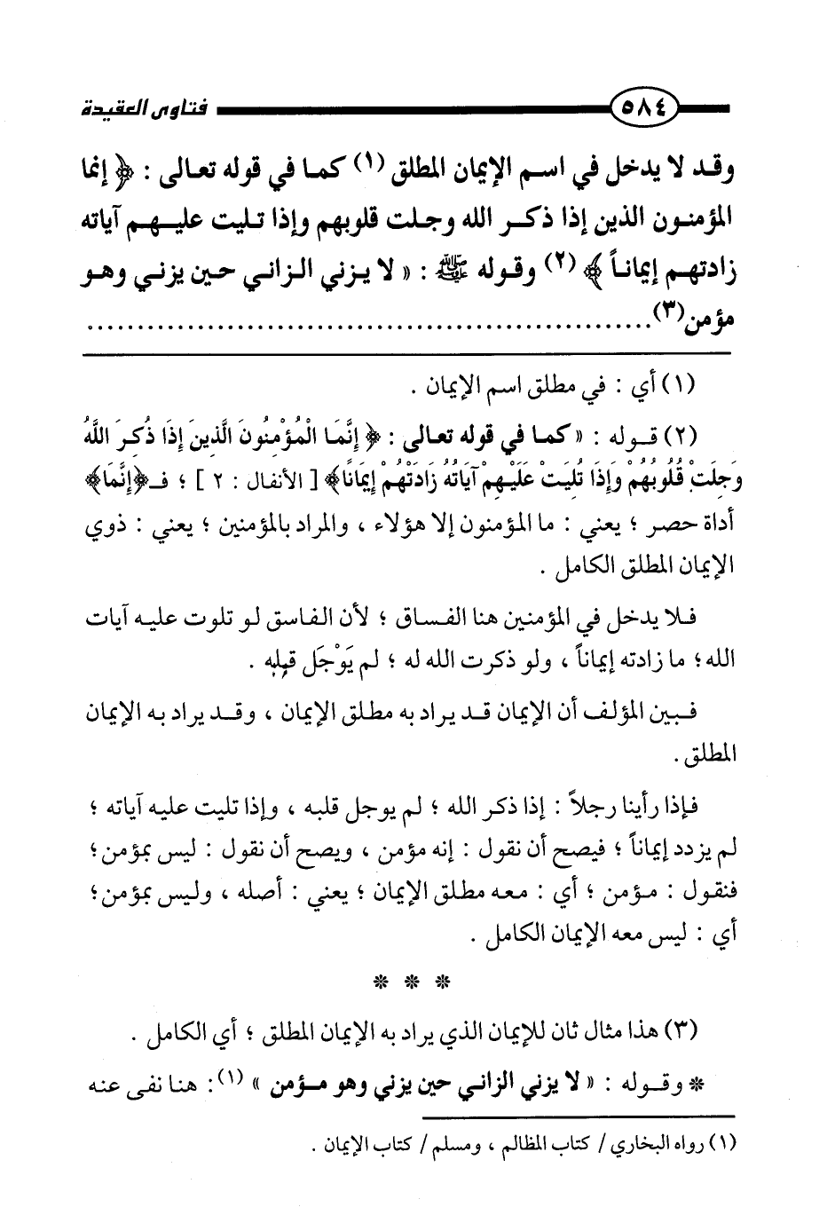 وقد لايدخل في اسم الإيمان المطلق كما في قوله تعالى: {إِنَّمَا الْمُؤْمِنُونَ الَّذِينَ إِذَا ذُكِرَ اللَّهُ وَجِلَتْ قُلُوبُهُمْ وَإِذَا تُلِيَتْ عَلَيْهِمْ آيَاتُهُ زَادَتْهُمْ إِيمَانًا} وقوله صَلَّى اللَّهُ عَلَيْهِ وَسَلَّمَ: «لا يزني الزاني حين يزني وهو مؤمن»
