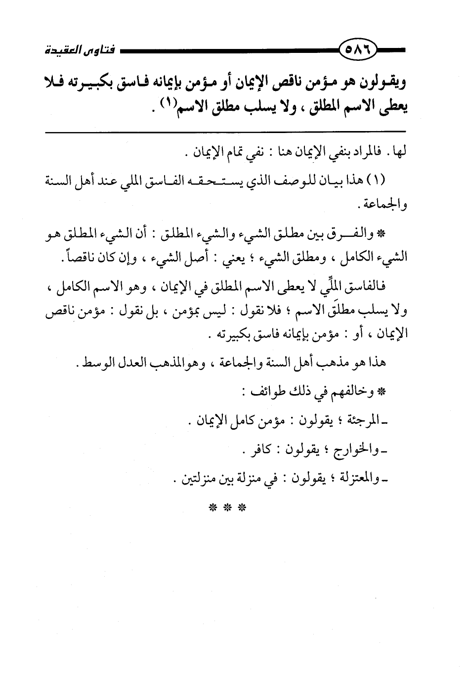 ويقولون هو مؤمن ناقص الإيمان أو مؤمن بإيمانه فاسق بكبيرته فلا يعطى الاسم المطلق، ولا يسلب مطلق الاسم