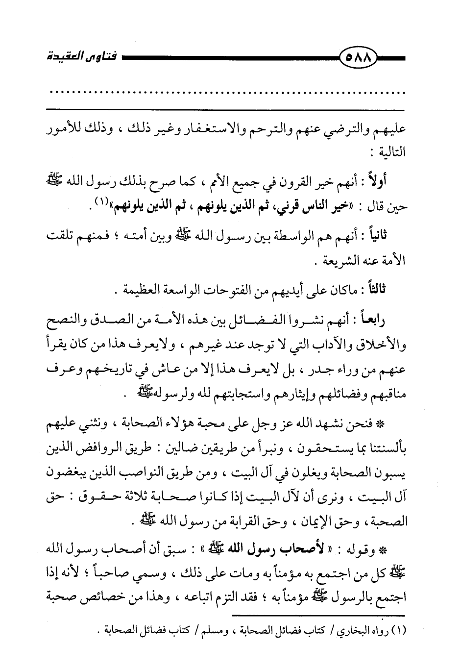 فنحن نشهد الله عز وجل على محبة هؤلاء الصحابة، ونثني عليهم بألسنتنا بما يستحقون، ونبرأ من طريقين ضالين: طريق الروافض الذين يسبون الصحابة ويغلون في آل البيت، ومن طريق النواصب الذين يبغضون آل البيت، وترى أن لآل البيت إذا كانوا صحابة ثلاثة حقوقة: حق الصحابة، وحق الإيمان، وحق القرابة من رسول الله صَلَّى اللَّهُ عَلَيْهِ وَسَلَّمَ.