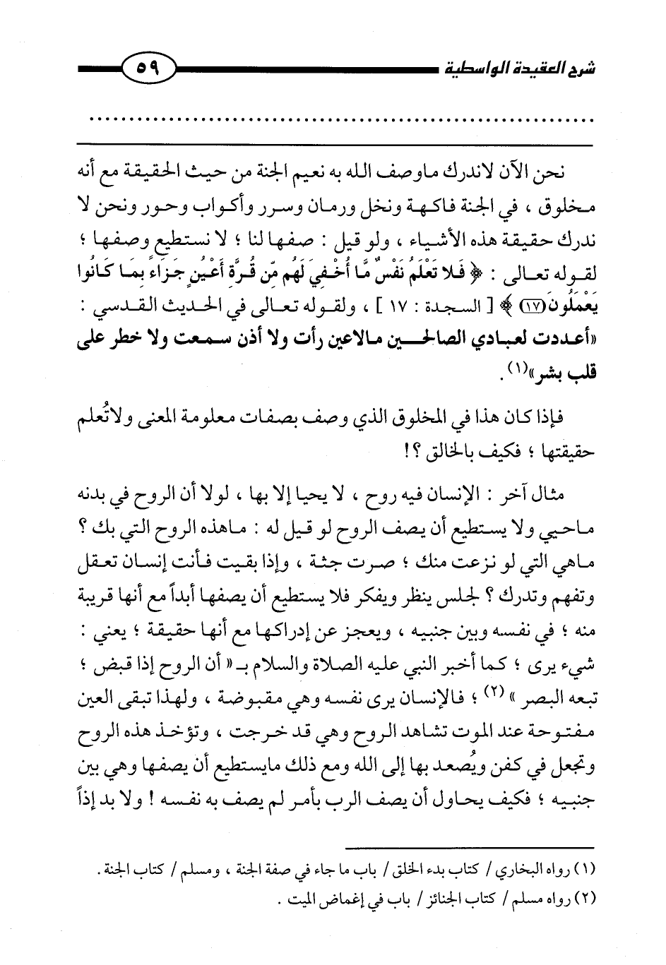 نحن الآن لا ندرك ما وصف الله به نعيم الجنة من حيث الحقيقة مع أنه مخلوق، في الجنة فاكهة ونخل ورمان وسرر وأكواب وحور ونحن لا ندرك حقيقة هذه الأشياء، ولو قيل: صفها لنا، لا نستطيع وصفها، لقوله تعالى: {فَلَا تَعْلَمُ نَفْسٌ مَا أُخْفِيَ لَهُمْ مِنْ قُرَّةِ أَعْيُنٍ جَزَاءً بِمَا كَانُوا يَعْمَلُونَ} [السجدة: 17] ، ولقوله تعالى في الحديث القدسي: «أعددت لعبادي الصالحين ما لا عين رأت ولا أذن سمعت ولا خطر على قلب بشر» . (¬1)