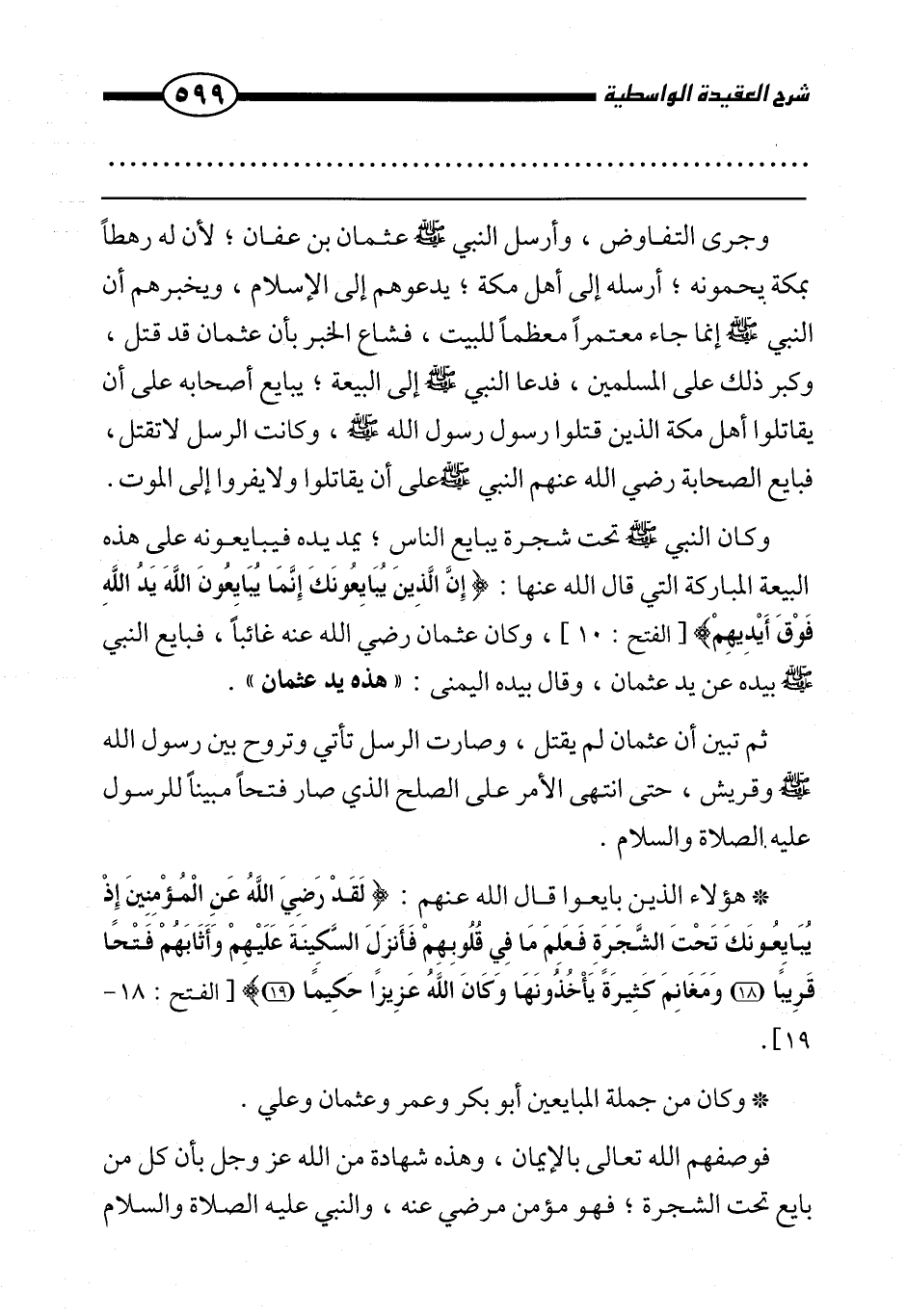 وكان النبي صَلَّى اللَّهُ عَلَيْهِ وَسَلَّمَ تحت شجرة يبايع الناس، يمد يده فيبايعونه على هذا البيعة المباركة التي قال الله عنها: {إِنَّ الَّذِينَ يُبَايِعُونَكَ إِنَّمَا يُبَايِعُونَ اللَّهَ يَدُ اللَّهِ فَوْقَ أَيْدِيهِمْ} [الفتح: 10] ، وكان عثمان رضي الله عنه غائبا، «فبايع النبي صَلَّى اللَّهُ عَلَيْهِ وَسَلَّمَ بيده عن يد عثمان، وقال بيده اليمنى: " هذه يد عثمان ".