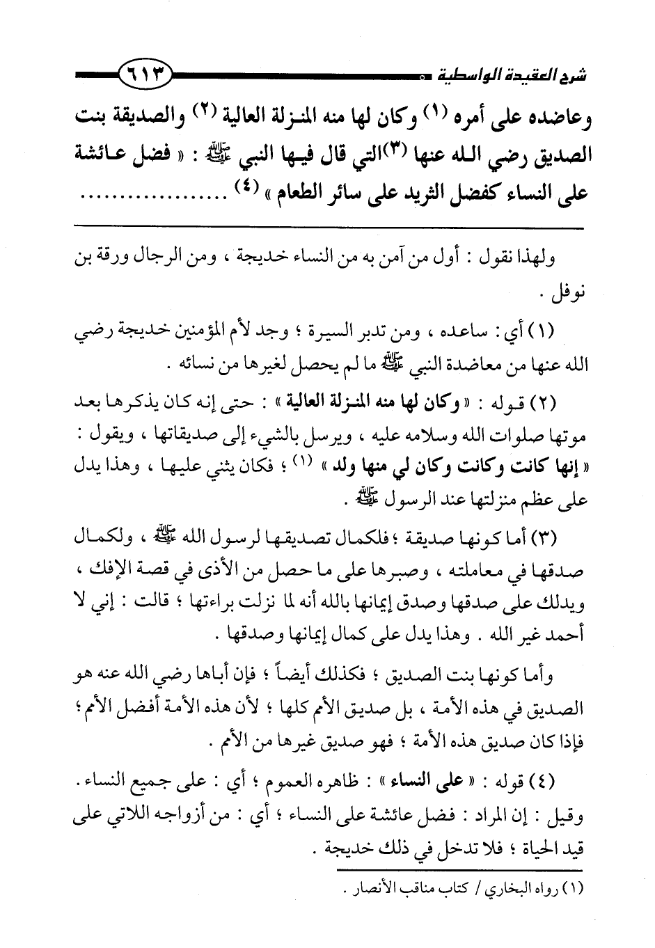 والصديقة بنت الصديق رضي الله عنها التي قال فيها النبي صَلَّى اللَّهُ عَلَيْهِ وَسَلَّمَ: «فضل عائشة على النساء كفضل الثريد على سائر الطعام»