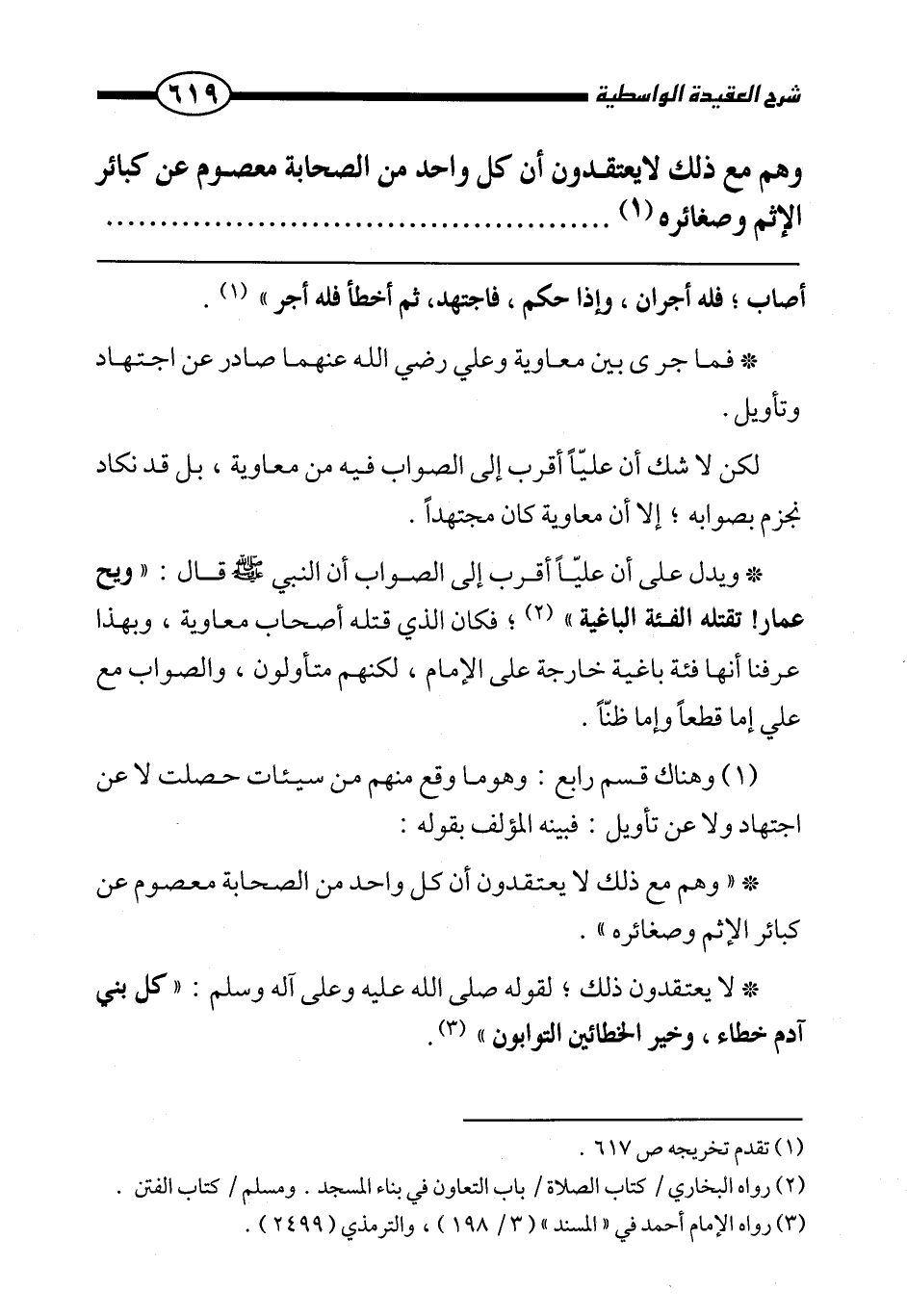 ويدل على أن عليا أقرب إلى الصواب أن النبي صَلَّى اللَّهُ عَلَيْهِ وَسَلَّمَ قال: «ويح عمارا تقتله الفئة الباغية» ، فكان الذي قتله أصحاب معاوية، وبهذا عرفنا أنها فئة باغية خارجة على الإمام، لكنهم متأولون، والصواب مع علي إما قطعا وإما ظنا.