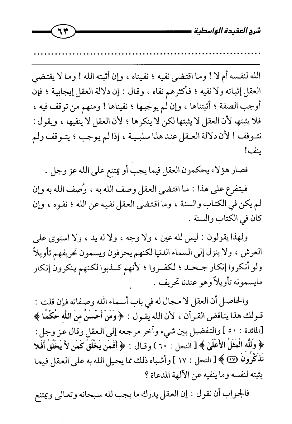 والحاصل أن العقل لا مجال له في باب أسماء الله وصفاته فإن قلت: قولك هذا يناقض القرآن؛ لأن الله يقول: {وَمَنْ أَحْسَنُ مِنَ اللَّهِ حُكْمًا} [المائدة: 50] والتفضيل بين شيء وآخر مرجعه إلى العقل وقال عز وجل {وَلِلَّهِ الْمَثَلُ الْأَعْلَى} [النحل: 60] وقال: {أَفَمَنْ يَخْلُقُ كَمَنْ لَا يَخْلُقُ أَفَلَا تَذَكَّرُونَ} [النحل: 17] وأشباه ذلك مما يحيل الله به على العقل فيما يثبته لنفسه وما ينفيه عن الآلهة المدعاة؟