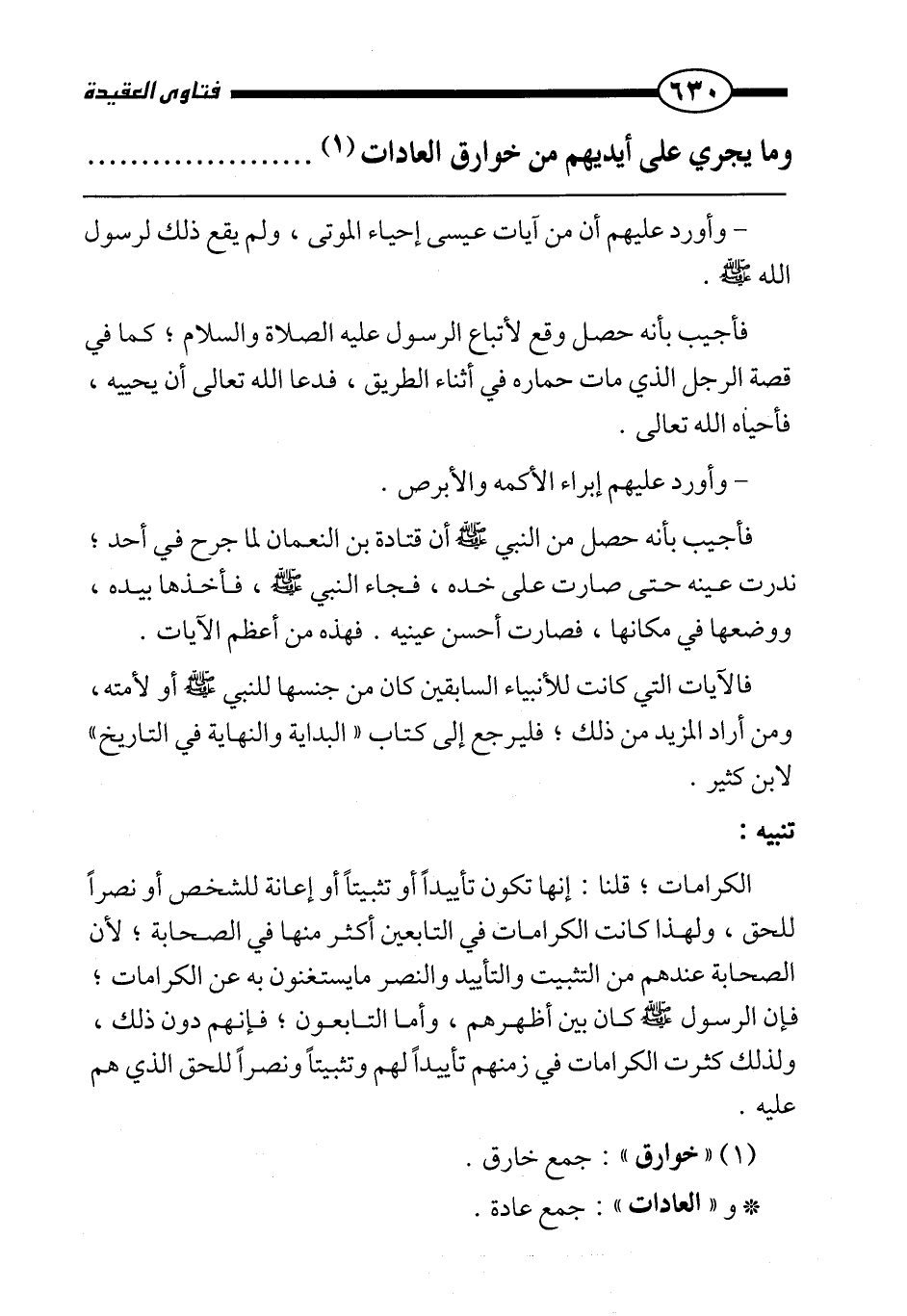الكرامات، قلنا: إنها تكون تأييدا أو تثبيتا أو إعانة للشخص أو نصرا للحق، ولهذا كانت الكرامات في التابعين أكثر منها في الصحابة، لأن الصحابة عندهم من التثبيت والتأييد والنصر ما يستغنون به عن الكرامات فإن الرسول صَلَّى اللَّهُ عَلَيْهِ وَسَلَّمَ كان بين أظهرهم، وأما التابعون، فإنهم دون ذلك، ولذلك كثرت الكرامات في زمنهم تأييدا لهم وتثبيتا ونصرا للحق الذي هم عليه.
