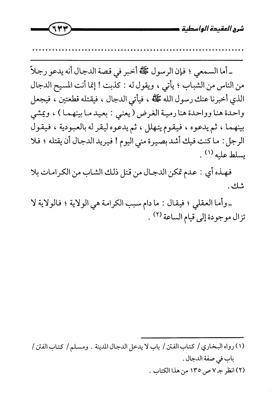 - أما السمعي، فإن الرسول صَلَّى اللَّهُ عَلَيْهِ وَسَلَّمَ أخبر في قصة الدجال أنه يدعو رجلا من الناس من الشباب، يأتي، ويقول له: كذبت! إنما أنت المسيح الدجال الذي أخبرنا عنك رسول الله صَلَّى اللَّهُ عَلَيْهِ وَسَلَّمَ، فيأتي الدجال، فيقتله قطعتين، فيجعل واحدة هنا وواحدة هنا رمية الغرض (يعني: بعيد ما بينهما) ، ويمشي بينهما، ثم يدعوه، فيقوم يتهلل، ثم يدعوه ليقر له بالعبودية، فيقول الرجل: ما كنت فيك أشد بصيرة مني اليوم! فيريد الدجال أن يقتله، فلا يسلط عليه.