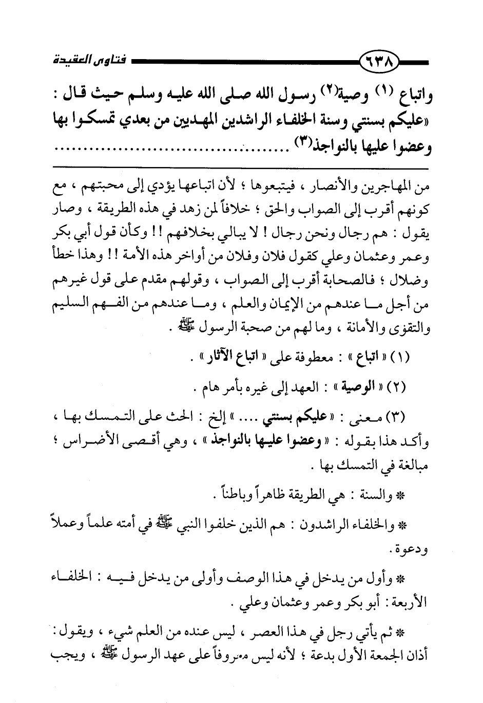 واتباع وصية رسول الله صَلَّى اللَّهُ عَلَيْهِ وَسَلَّمَ حيث قال: «عليكم بسنتي وسنة الخلفاء الراشدين المهديين من بعدي تمسكوا بها وعضوا عليها بالنواجذ»