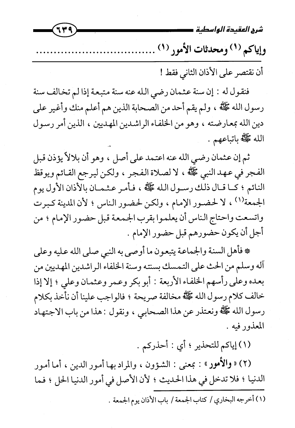 ثم إن عثمان رضي الله عنه اعتمد على أصل، وهو أن بلالا يؤذن قبل الفجر في عهد النبي صَلَّى اللَّهُ عَلَيْهِ وَسَلَّمَ، لا لصلاة الفجر، ولكن ليرجع القائم ويوقظ النائم، كما قال ذلك رسول الله صَلَّى اللَّهُ عَلَيْهِ وَسَلَّمَ، فأمر عثمان بالأذان الأول يوم الجمعة، لا لحضور الإمام، ولكن لحضور الناس، لأن المدينة كبرت واتسعت واحتاج الناس أن يعلموا بقرب الجمعة قبل حضور الإمام، من أجل أن يكون حضورهم قبل حضور الإمام.