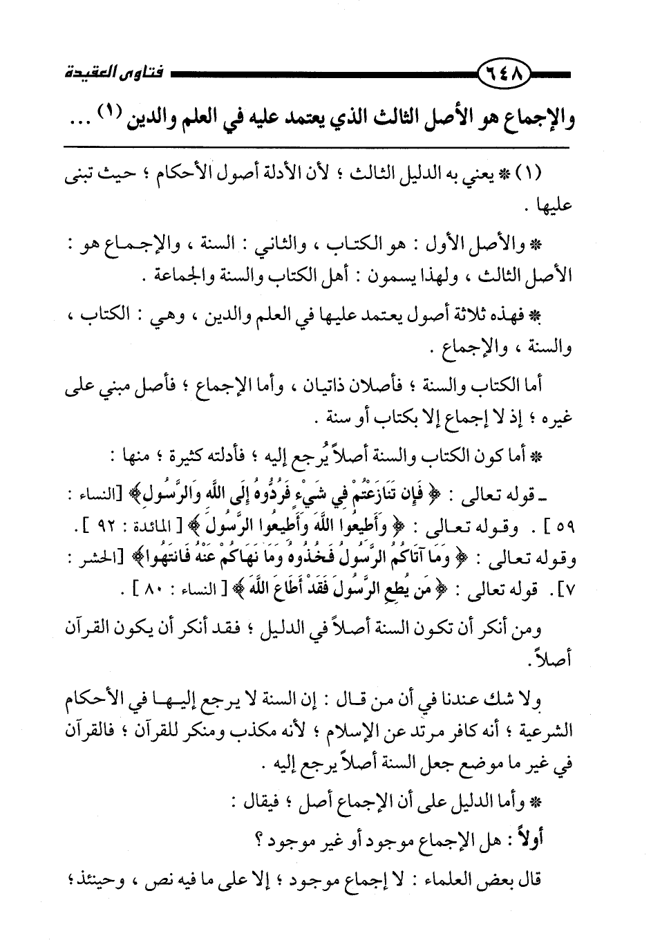 والإجماع هو الأصل الثالث الذي يعتمد عليه في العلم والدين
