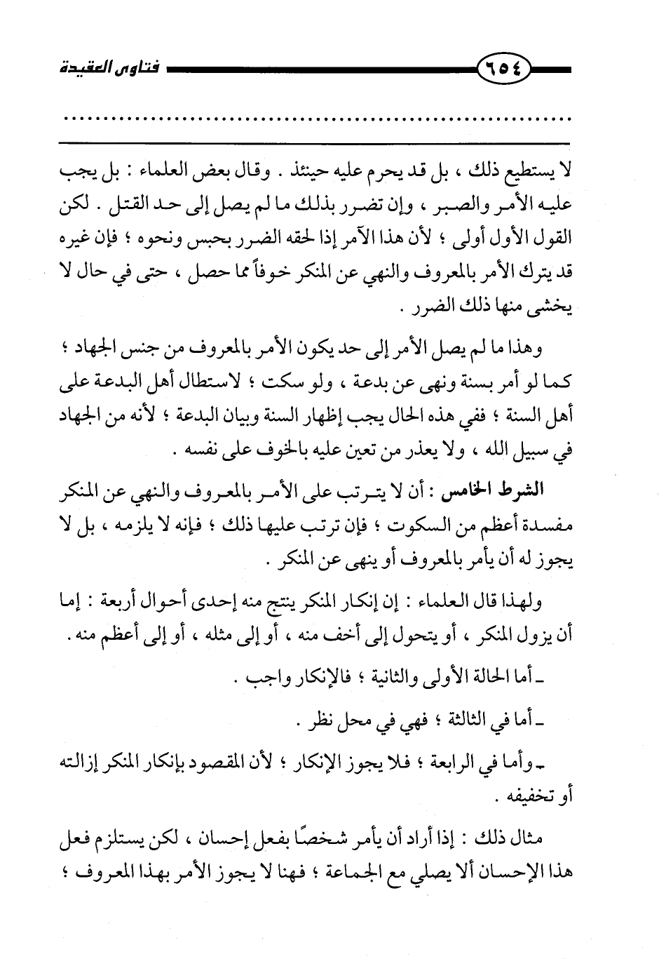 الشرط الخامس: أن لا يترتب على الأمر بالمعروف والنهي عن المنكر مفسدة أعظم من السكوت، فإن ترتب عليها ذلك، فإنه لا يلزمه، بل لا يجوز له أن يأمر بالمعروف أو ينهى عن المنكر.