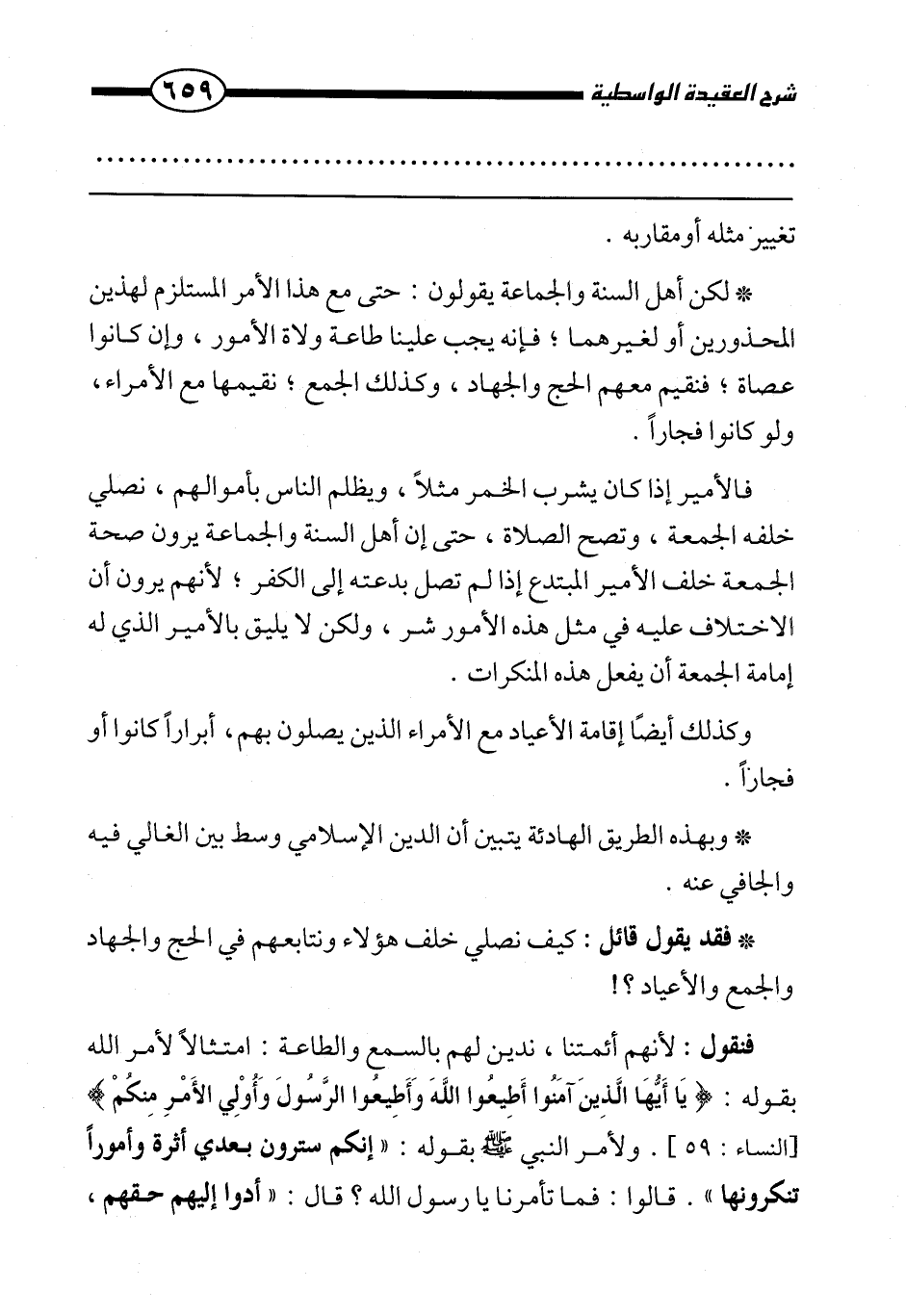 لكن أهل السنة والجماعة يقولون: حتى مع هذا الأمر المستلزم لهذين المحذورين أو لغيرهما، فإنه يجب علينا طاعة ولاة الأمور، وإن كانوا عصاة، فنقيم معهم الحج والجهاد، وكذلك الجمع، نقيمها مع الأمراء، ولو كانوا فجارا.