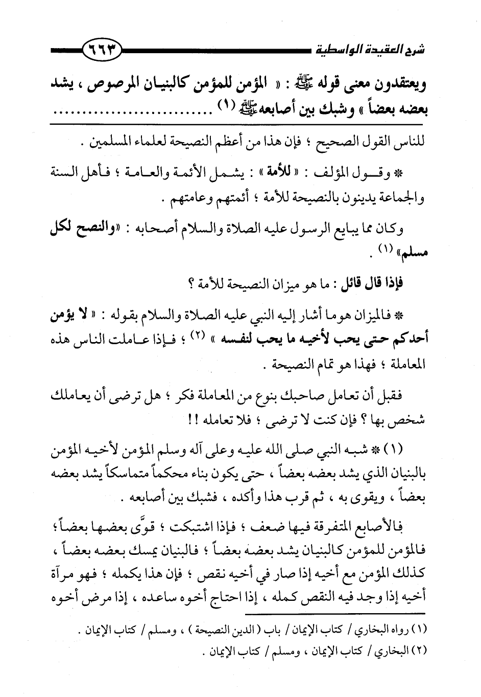 شبه النبي صلى الله عليه وعلى آله وسلم المؤمن لأخيه المؤمن بالبنيان الذي يشد بعضه بعضا، حتى يكون بناء محكما متماسكا يشد بعضه بعضا ويقوى به، ثم قرب هذا وأكده، فشبك بين أصابعه.