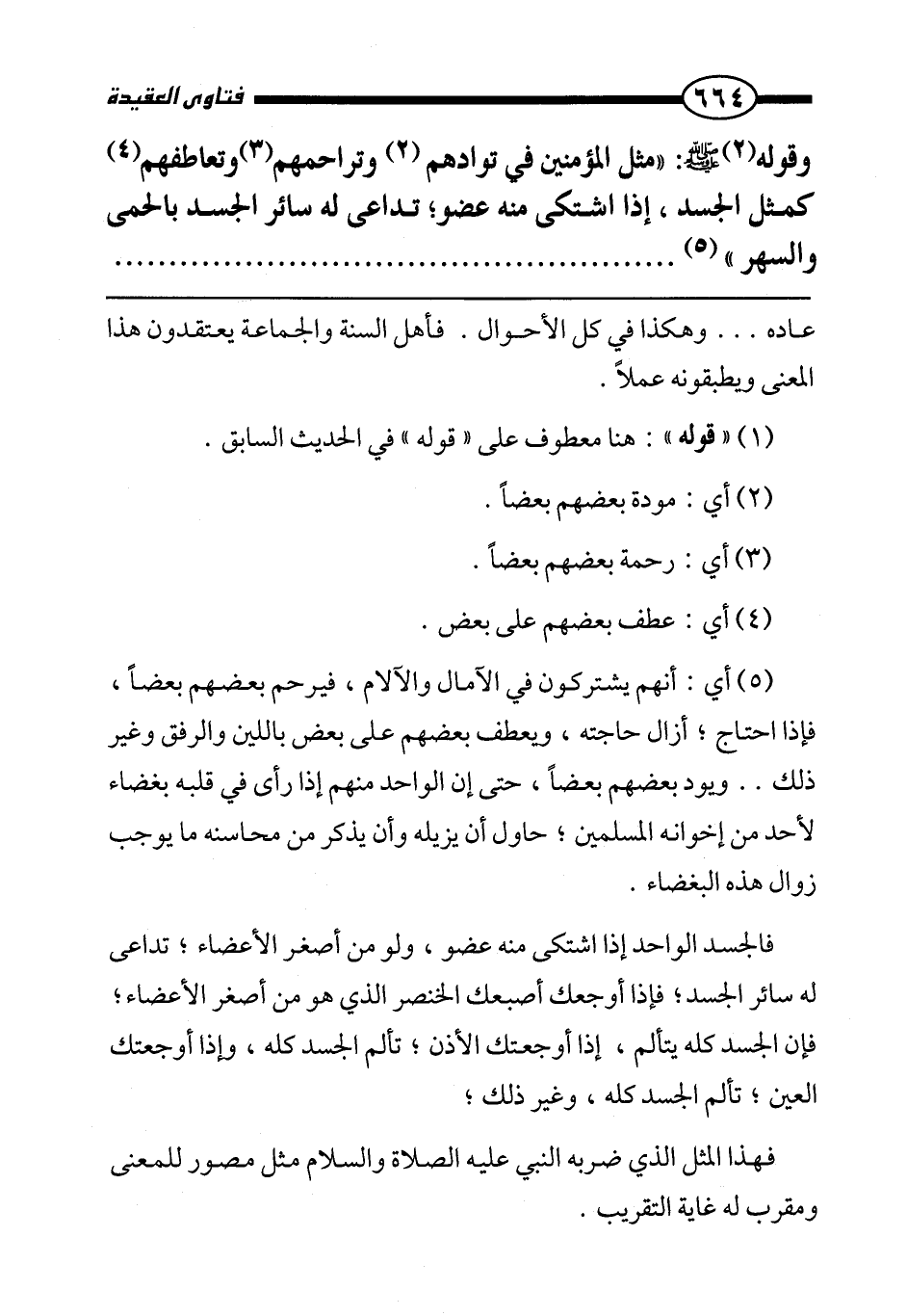 وقوله صَلَّى اللَّهُ عَلَيْهِ وَسَلَّمَ: «مثل المؤمنين في توادهم وتراحمهم وتعاطفهم كمثل الجسد، إذا اشتكى منه عضو، تداعى له سائر الجسد بالحمى والسهر» .