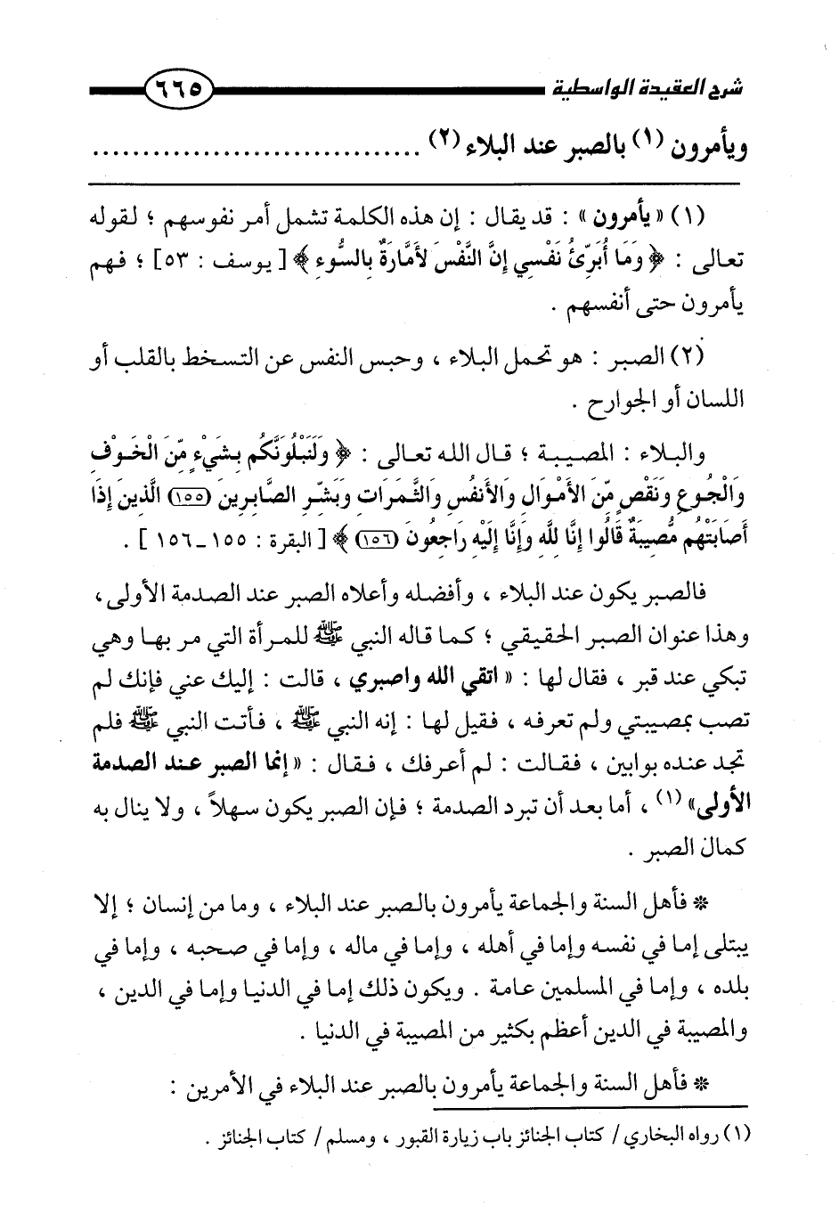 فالصبر يكون عند البلاء، وأفضله وأعلاه الصبر عند الصدمة الأولى، وهذا عنوان الصبر الحقيقي، كما «قاله النبي صَلَّى اللَّهُ عَلَيْهِ وَسَلَّمَ للمرأة التي مر بها وهي تبكي عند قبر، فقال لها: " اتقي الله واصبري، قالت: إليك عني فإنك لم تصب بمصيبتي ولم تعرفه، فقيل لها: إنه النبي صَلَّى اللَّهُ عَلَيْهِ وَسَلَّمَ فأتت النبي صَلَّى اللَّهُ عَلَيْهِ وَسَلَّمَ فلم تجد عنده بوابين، فقالت: لم أعرفك، فقال: " إنما الصبر عند الصدمة الأولى» ، أما بعد أن تبرد الصدمة، فإن الصبر يكون سهلا، ولا ينال به كمال الصبر.