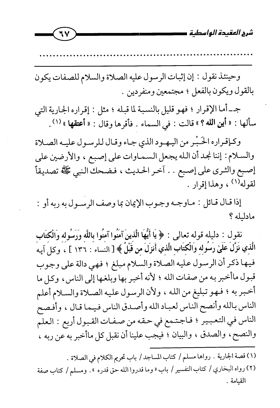 نقول: دليله قوله تعالى: {يَا أَيُّهَا الَّذِينَ آمَنُوا آمِنُوا بِاللَّهِ وَرَسُولِهِ وَالْكِتَابِ الَّذِي نَزَّلَ عَلَى رَسُولِهِ وَالْكِتَابِ الَّذِي أَنْزَلَ مِنْ قَبْلُ} [النساء: 136] ، وكل آية فيها ذكر أن الرسول عليه الصلاة والسلام مبلغ؛ فهي دالة على وجوب قبول ما أخبر به من صفات الله؛ لأنه أخبر بها وبلغها إلى الناس، وكل ما أخبر به؛ فهو تبليغ من الله، ولأن الرسول عليه الصلاة والسلام أعلم الناس بالله وأنصح الناس لعباد الله وأصدق الناس فيما قال، وأفصح الناس في التعبير، فاجتمع في حقه من صفات القبول أربع: العلم والنصح، والصدق، والبيان؛ فيجب علينا أن نقبل كل ما أخبر به عن ربه،
