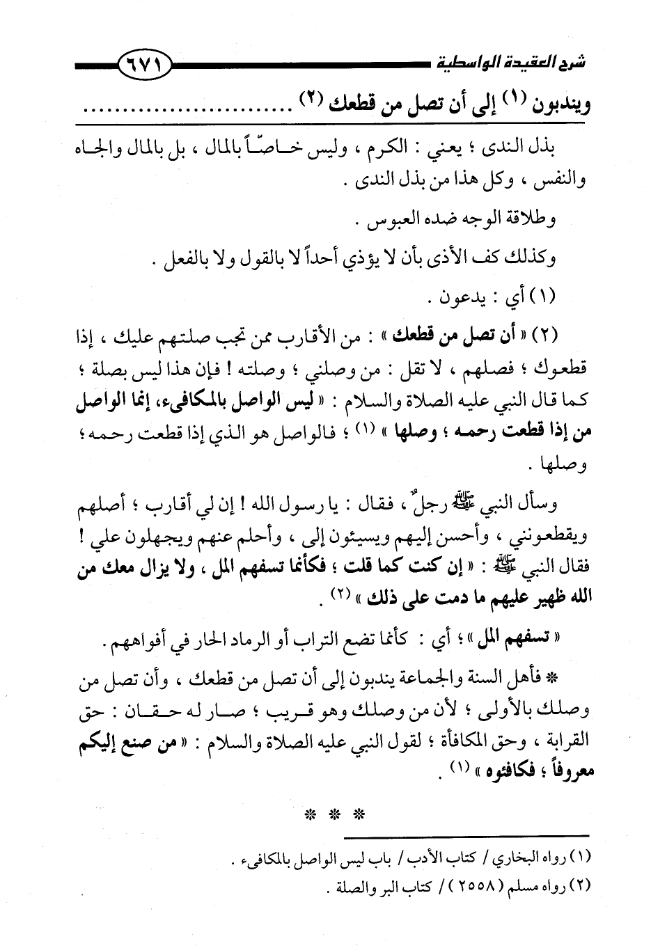 «وسأل النبي صَلَّى اللَّهُ عَلَيْهِ وَسَلَّمَ رجل، فقال: يا رسول الله! إن لي أقارب، أصلهم ويقطعونني، وأحسن إليهم ويسيئون إلي، وأحلم عنهم ويجهلون علي! فقال النبي صَلَّى اللَّهُ عَلَيْهِ وَسَلَّمَ: " إن كنت كما قلت، فكأنما تسفهم الملل، ولا يزال معك من الله ظهير عليهم ما دمت على ذلك» .