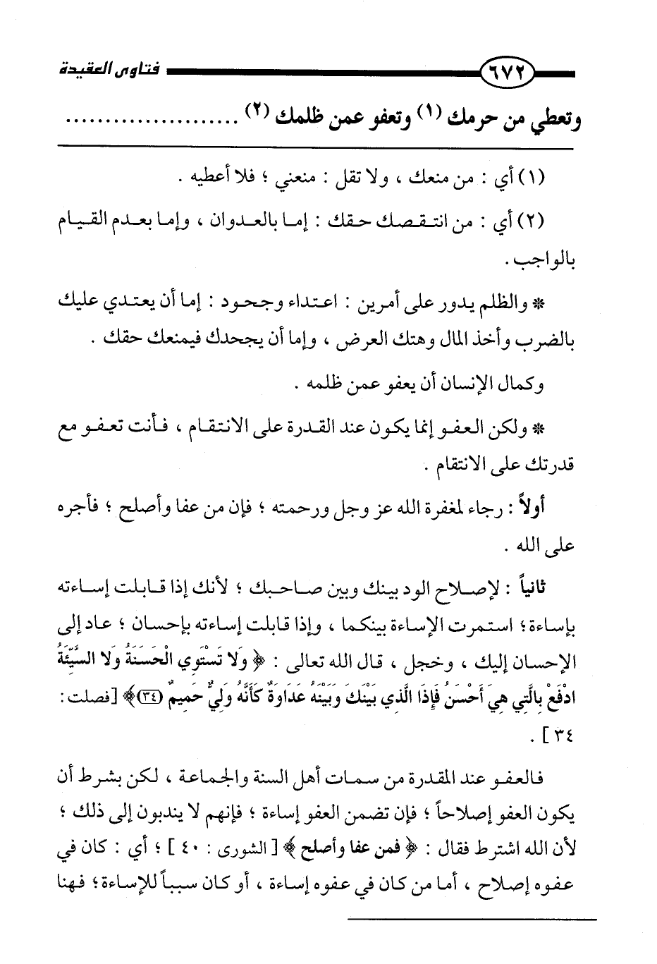 فالعفو عند المقدرة من سمات أهل السنة والجماعة، لكن بشرط أن يكون العفو إصلاحا، فإن تضمن العفو إساءة، فإنهم لا يندبون إلى ذلك لأن الله اشترط فقال: {فَمَنْ عَفَا وَأَصْلَحَ} [الشورى: 40] ، أي: كان في عفو إصلاح، أما من كان في عفوه إساءة، أو كان سببا للإساءة، فهنا