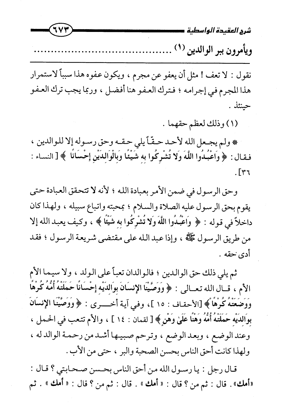 ولم يجعل الله لأحد حقا يلي حقه وحق رسوله إلا للوالدين، فقال: {وَاعْبُدُوا اللَّهَ وَلَا تُشْرِكُوا بِهِ شَيْئًا وَبِالْوَالِدَيْنِ إِحْسَانًا} [النساء: 36] .