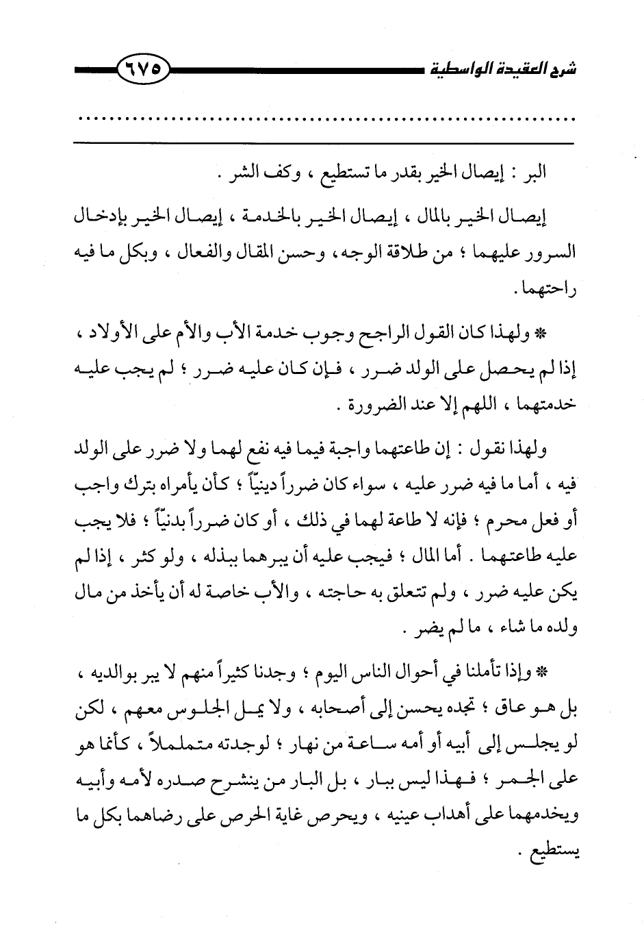 ولهذا نقول: إن طاعتهما واجبة فيما فيه نفع لهما ولا ضرر على الولد فيه، أما ما فيه ضرر عليه، سواء كان ضررا دينيا، كأن يأمراه بترك واجب أو فعل محرم، فإنه لا طاعة لهما في ذلك، أو كان ضررا بدنيا، فلا يجب عليه طاعتهما. أما المال، فيجب عليه أن يبرهما ببذله، ولو كثر إذا لم يكن عليه ضرر، ولم تتعلق به حاجته، والأب خاصة له أن يأخذ من مال ولده ما شاء، ما لم يضر.