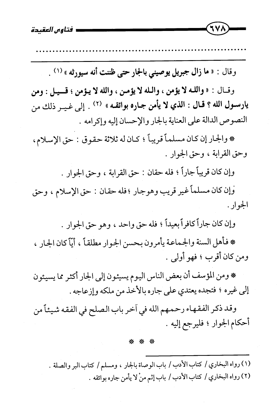 وقال: «والله لا يؤمن، والله لا يؤمن، والله لا يؤمن، قيل: ومن يا رسول الله؟ قال: الذي لا يأمن جاره بوائقه» . إلى غير ذلك من النصوص الدالة على العناية بالجار والإحسان إليه وإكرامه.