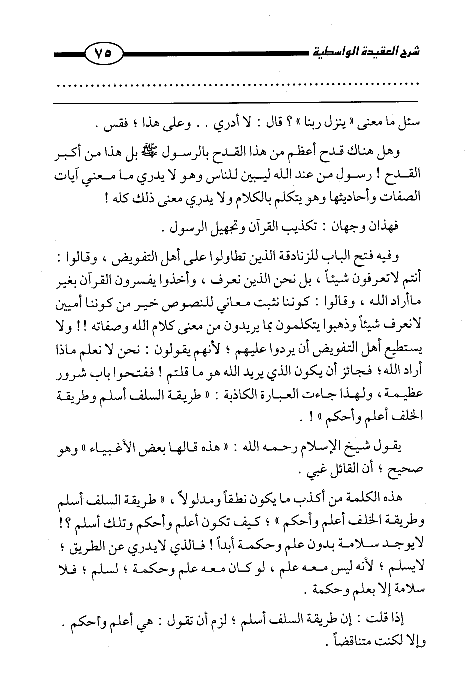 وهل هناك قدح أعظم من هذا القدح بالرسول صَلَّى اللَّهُ عَلَيْهِ وَسَلَّمَ بل هذا من أكبر القدح! رسول من عند الله ليبين للناس وهو لا يدري ما معنى آيات الصفات وأحاديثها وهو يتكلم بالكلام ولا يدري معنى ذلك كله.