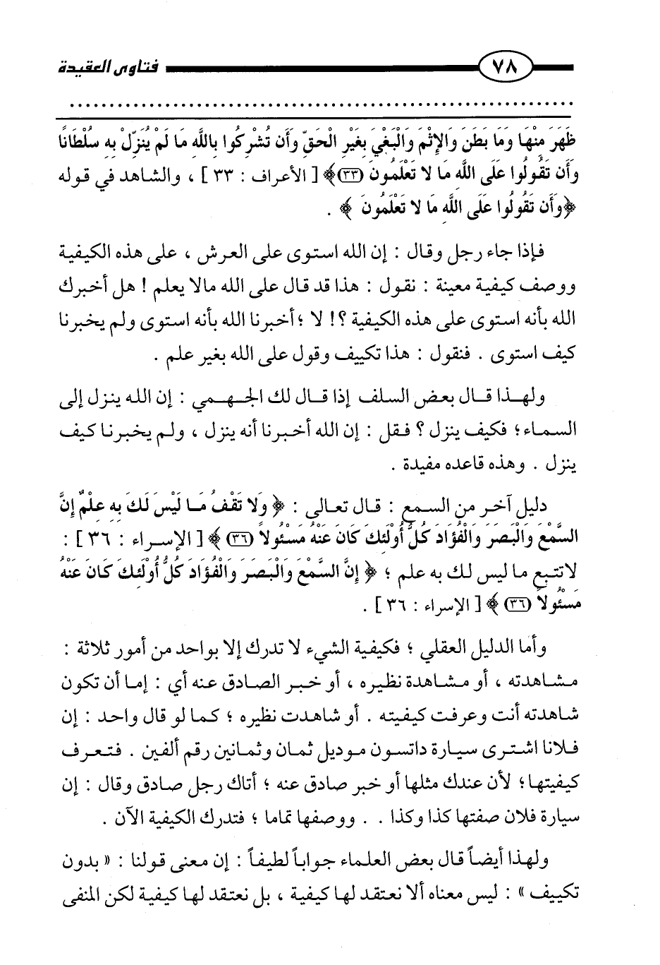 ولهذا أيضًا قال بعض العلماء جوابًا لطيفًا: إن معنى قولنا: " بدون تكييف ": ليس معناه ألا نعتقد لها كيفية، بل نعتقد لها كيفية لكن المنفي