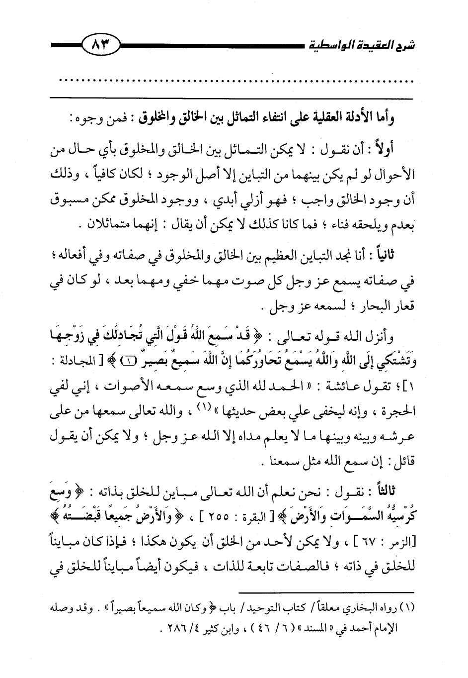 «وأنزل الله قوله تعالى: {قَدْ سَمِعَ اللَّهُ قَوْلَ الَّتِي تُجَادِلُكَ فِي زَوْجِهَا وَتَشْتَكِي إِلَى اللَّهِ وَاللَّهُ يَسْمَعُ تَحَاوُرَكُمَا إِنَّ اللَّهَ سَمِيعٌ بَصِيرٌ} [المجادلة: 1] ، تقول عائشة: " الحمد لله الذي وسع سمعه الأصوات، إني لفي الحجرة، وإنه ليخفى عليَّ بعض حديثها» (¬1) ، والله تعالى سمعها من على عرشه وبينه وبينها ما لا يعلم مداه إلا الله عز وجل، ولا يمكن أن يقول قائل: إن سمع الله مثل سمعنا.