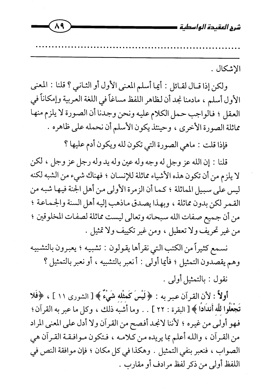 أولًا: لأن القرآن عبر به: {لَيْسَ كَمِثْلِهِ شَيْءٌ} [الشورى: 11] ، {فَلَا تَجْعَلُوا لِلَّهِ أَنْدَادًا} [البقرة: 22] . . وما أشبه ذلك، وكل ما عبر به القرآن؛ فهو أولى من غيره؛ لأننا لا نجد أفصل من القرآن ولا أدل على المعنى المراد من القرآن، والله أعلم بما يريده من كلامه، فتكون موافقة القرآن هي الصواب، فنعبر بنفي التمثيل. وهكذا في كل مكان، فإن موافقة النص في اللفظ أولى من ذكر لفظ مرادف أو مقارب.