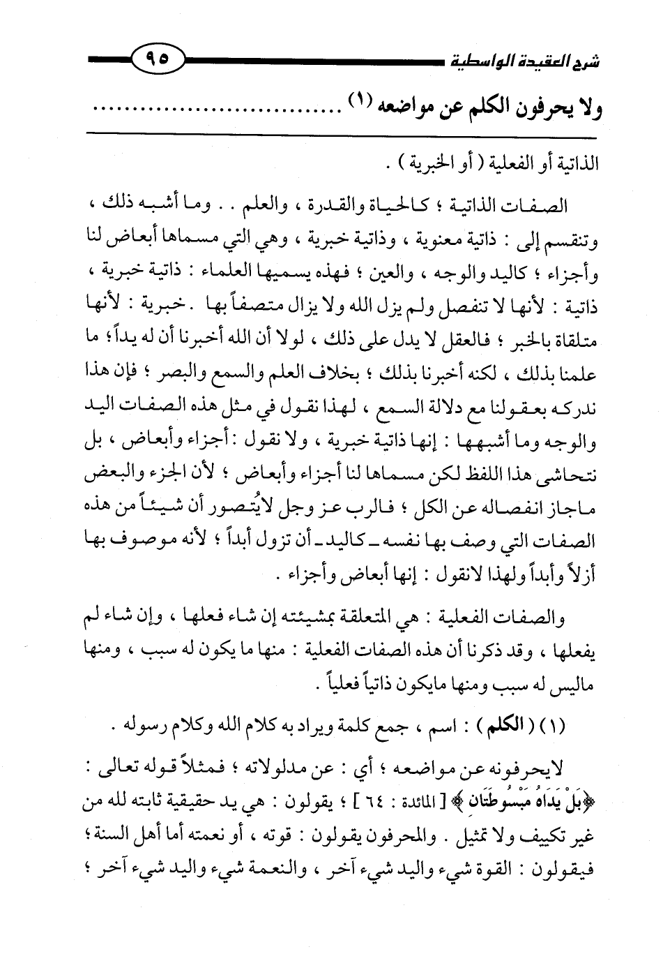لا يحرفونه عن مواضعه؛ أي: عن مدلولاته، فمثلًا قوله تعالى: {بَلْ يَدَاهُ مَبْسُوطَتَانِ} [المائدة: 64] ، يقولون: هي يد حقيقية ثابتة لله من غير تكييف ولا تمثيل. والمحرفون يقولون: قوته، أو نعمته أما أهل السنة؛ فيقولون: القوة شيء واليد شيء آخر، والنعمة شيء واليد شيء آخر؛