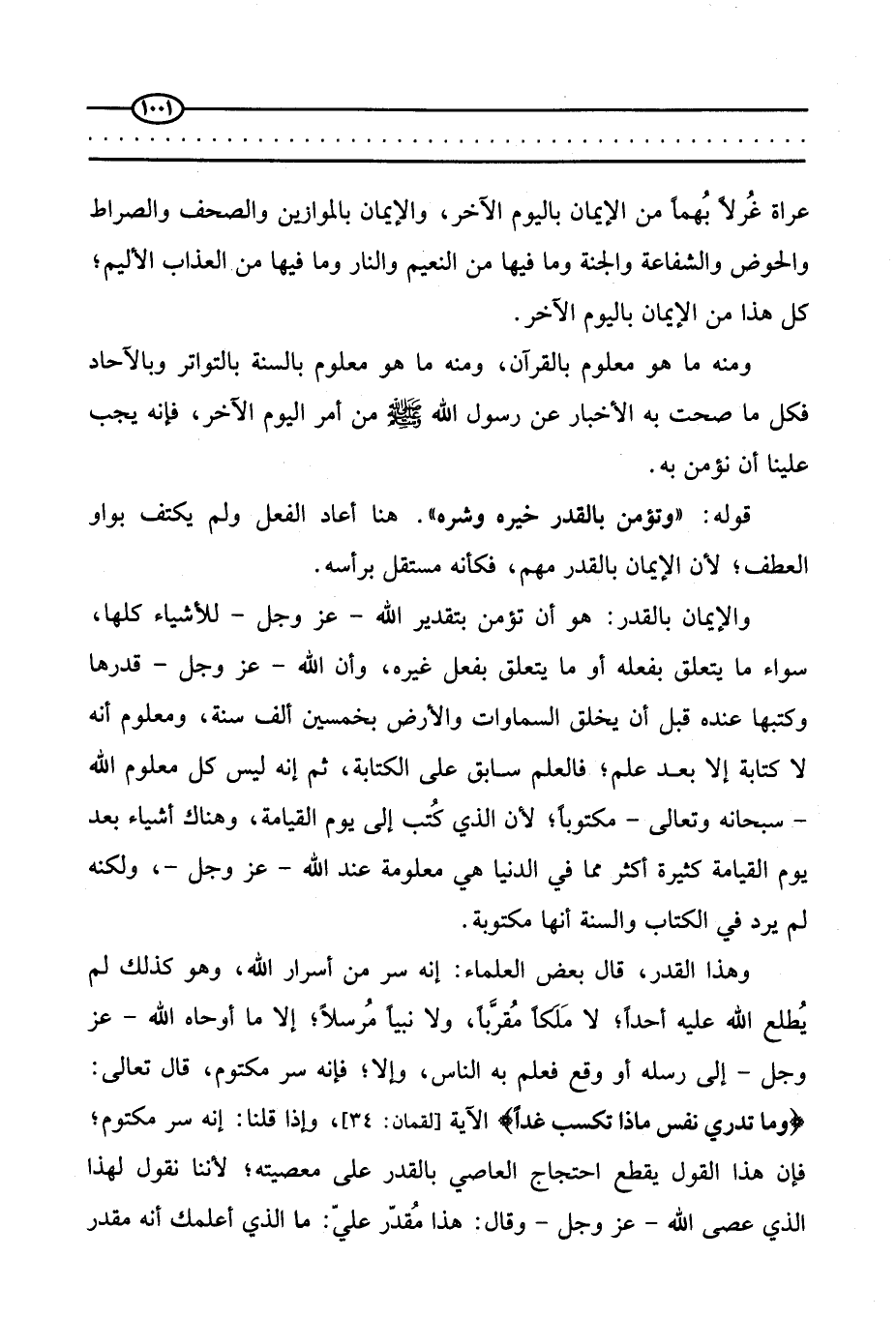 وهذا القدر، قال بعض العلماء: إنه سر من أسرار الله، وهو كذلك لم يطلع الله عليه أحدا، لا ملكا مقربا ولا نبيا مرسلا، إلا ما أوحاه الله - عز وجل - إلى رسله أو وقع فعلم به الناس، وإلا، فإنه سر مكتوم، قال تعالى: {وَمَا تَدْرِي نَفْسٌ مَاذَا تَكْسِبُ غَدًا} الآية (لقمان:34) ، وإذا قلنا: إنه سر مكتوم، فإن هذا القول يقطع احتجاج العاصي بالقدر على معصيته، لأننا نقول لهذا الذي عصى الله - عز وجل - وقال هذا مقدر عليّ: ما الذي أعلمك أنه مقدر