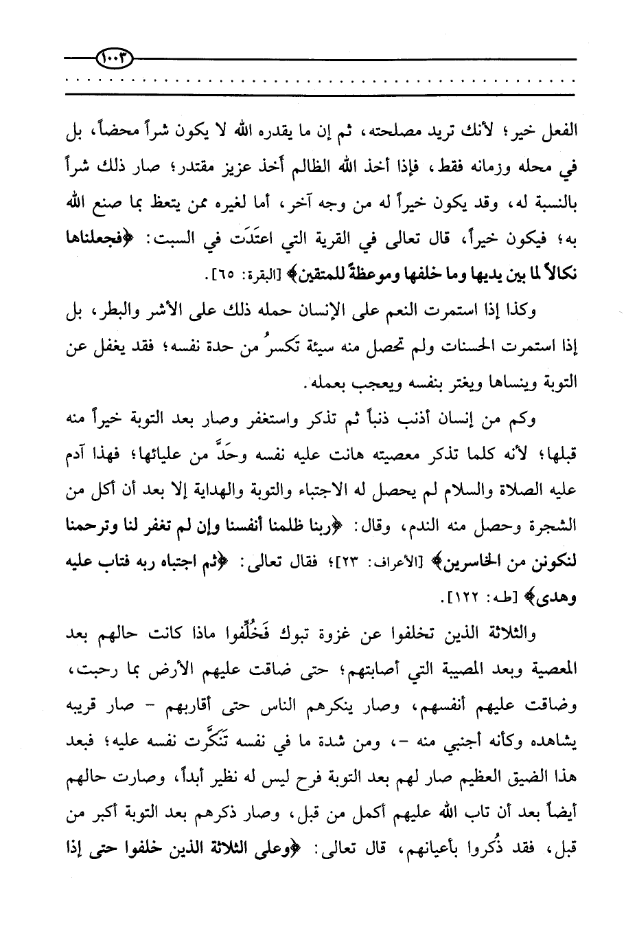 والثلاثة الذين تخلفوا عن غزوة تبوك فَخُلِّفوا ماذا كانت حالتهم بعد المعصية وبعد المصيبة التي أصابتهم، حتى ضاقت عليهم الأرض بما رحبت، وضاقت عليهم أنفسهم، وصار ينكرهم الناس حتى أقاربهم - صار قريبه يشاهده وكأنه أجنبي منه، ومن شدة ما في نفسه تنكرت نفسه عليه، فبعد هذا الضيق العظيم صار لهم بعد التوبة فرح ليس له نظير أبدا، وصارت حالهم أيضا بعد أن تاب الله عليهم أكمل من قبل، وصار ذكرهم بعد التوبة أكبر من قبل، فقد ذكروا بأعيانهم، قال تعالى: