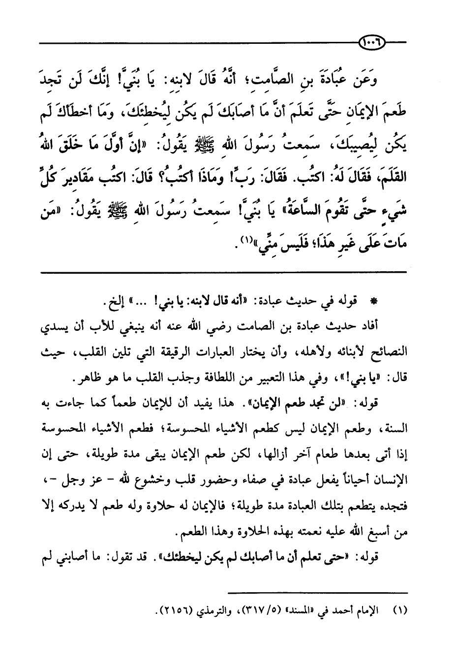 وعن عبادة بن الصامت، أنه قال لأبنه: يا بني! إنك لن تجد طعم الإيمان حتى تعلم أن ما أصابك لم يكن ليخطئك، وما أخطأك لم يكن ليصيبك،، سمعت رسول الله صَلَّى اللَّهُ عَلَيْهِ وَسَلَّمَ يقول: «إن أول ما خلق الله القلم، فقال له: اكتب. فقال: ربّ! وماذا أكتب؟ قال: اكتب مقادير كل شي حتى تقوم الساعة» يا بني! سمعت رسول الله صَلَّى اللَّهُ عَلَيْهِ وَسَلَّمَ يقول: «من مات على غير هذا، فليس مني» (¬1)