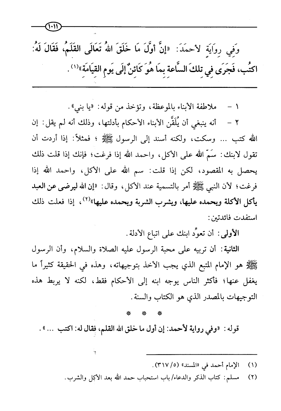 2 -أنه ينبغي أن يلقن الأبناء الأحكام بأدلتها، وذلك أنه لم يقل: إن الله كتب ... وسكت، ولكنه أسند إلى الرسول صَلَّى اللَّهُ عَلَيْهِ وَسَلَّمَ، فمثلا: إذا أردت أن تقول لابنك: سم الله على الأكل، واحمد الله إذا فرغت، فإنك إذا قلت ذلك يحصل به المقصود، لكن إذا قلت سم الله على الأكل واحمد الله إذا فرغت لأن النبي صَلَّى اللَّهُ عَلَيْهِ وَسَلَّمَ أمر بالتسمية عند الأكل، وقال: «إن الله ليرضى عن العبد يأكل الأكلة ويحمده عليها، ويشرب الشربة ويحمده عليها» إذا فعلت ذلك استفدت فائدتين: -