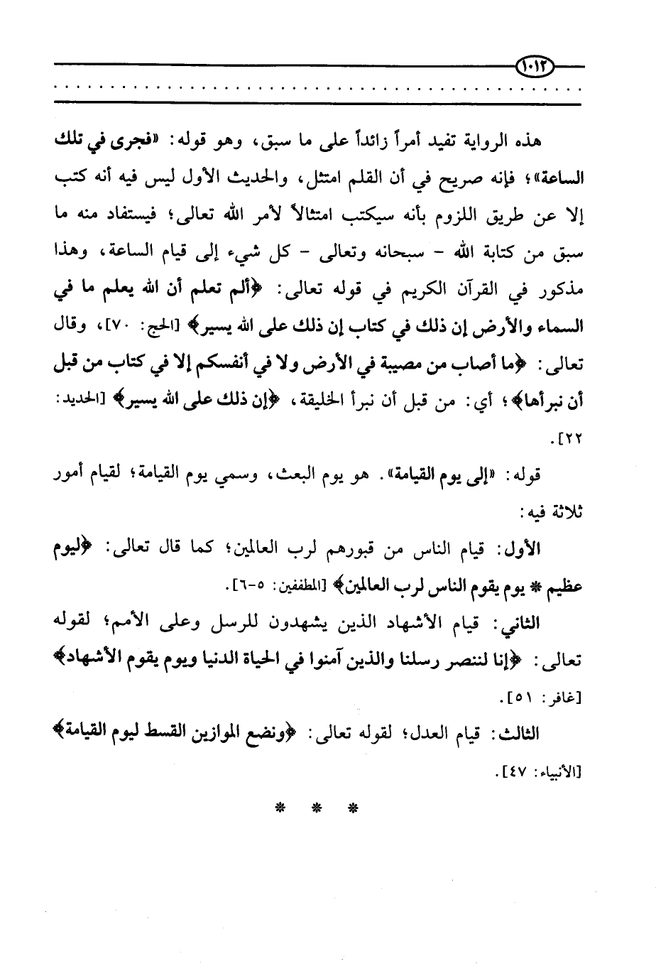 الثالث: قيام العدل، لقوله تعالى: {وَنَضَعُ الْمَوَازِينَ الْقِسْطَ لِيَوْمِ الْقِيَامَةِ} (الأنبياء: 47) .