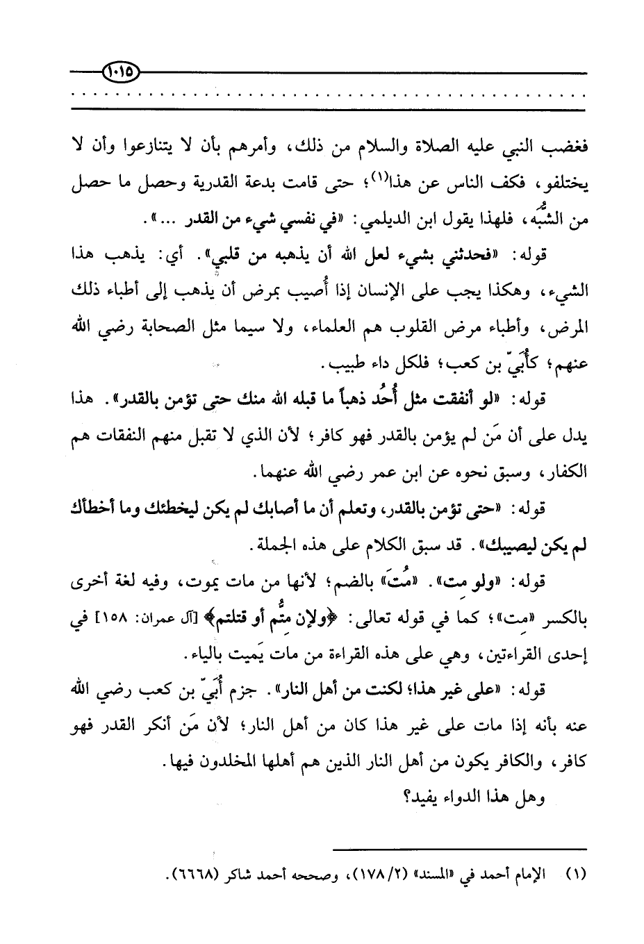 فغضب النبي عليه الصلاة والسلام من ذلك، وأمرهم بأن لا يتنازعوا وأن لا يختلفوا، فكف الناس عن هذا، (¬1) حتى قامت بدعة القدرية وحصل ما حصل من الشُّبه، فلهذا يقول ابن الديلمي: (في نفسي شيء من القدر ... ) .