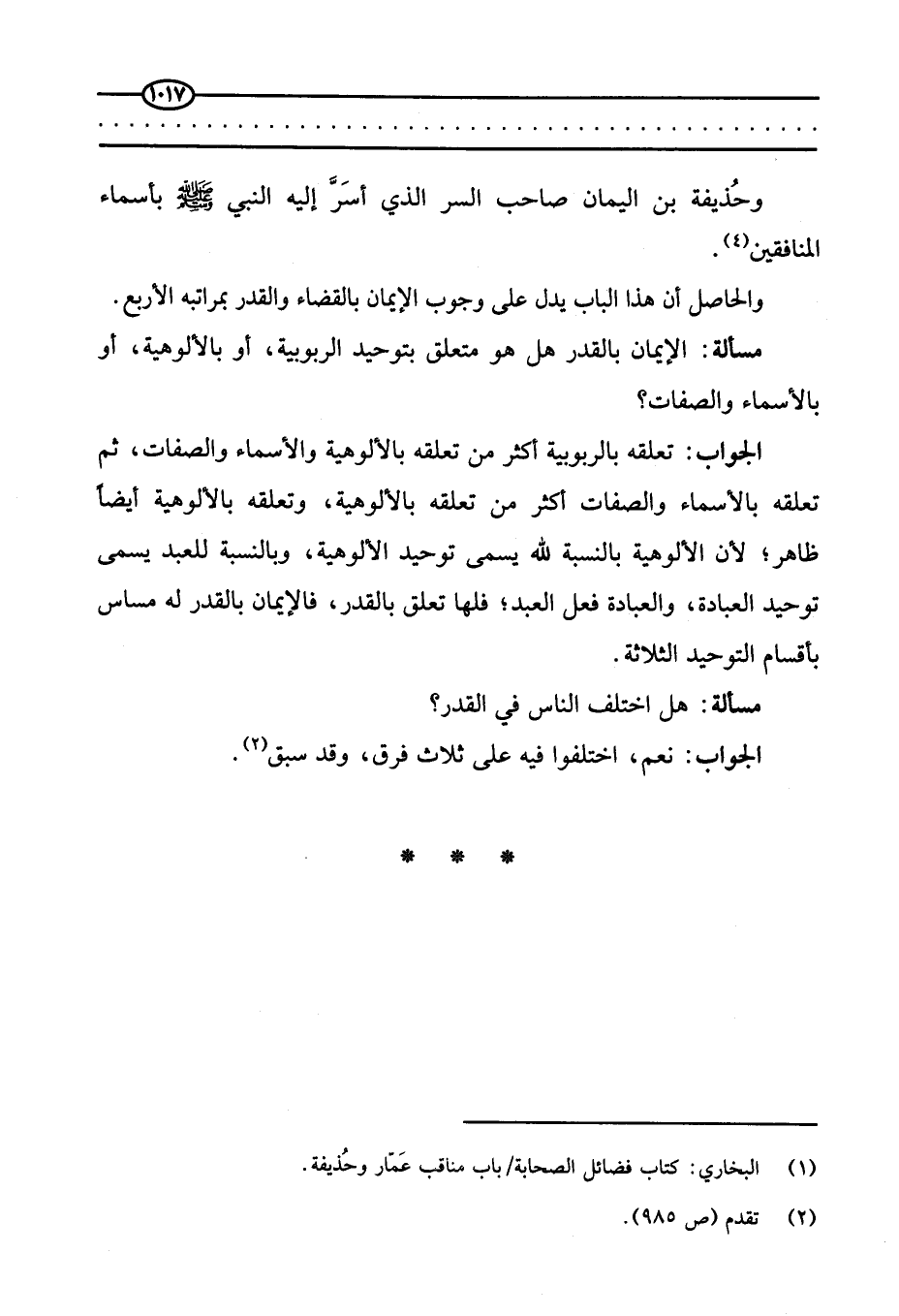 مسألة: الإيمان بالقدر هل هو متعلق بتوحيد الربوبية، أو بالألوهية، أو بالأسماء والصفات؟