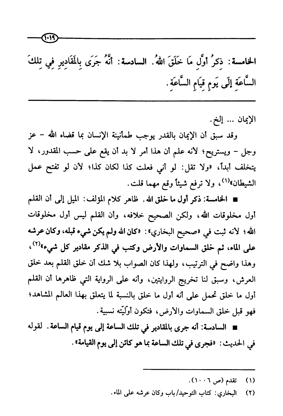 الخامسة: ذكر أول ما خلق الله. ظاهر كلام المؤلف: الميل إلى أن القلم أول مخلوقات الله، ولكن الصحيح خلافه، وأن القلم ليس أول مخلوقات الله؛ لأنه ثبت في (صحيح البخاري) : «كان الله ولم يكن شيء قبله، وكان عرشه على الماء، ثم خلق السماوات والأرض وكتب في الذكر مقادير كل شي» ، وهذا واضح في الترتيب، ولهذا كان الصواب بلا شك أن خلق القلم بعد خلق العرش، وسبق لنا تخريج الروايتين، وأنه على الرواية التي ظاهرها أن القلم أول ما خلق بالنسبة لما يتعلق بهذا العالم المشاهد، فهو قبل السماوات والأرض، فتكون أوليته نسبية.