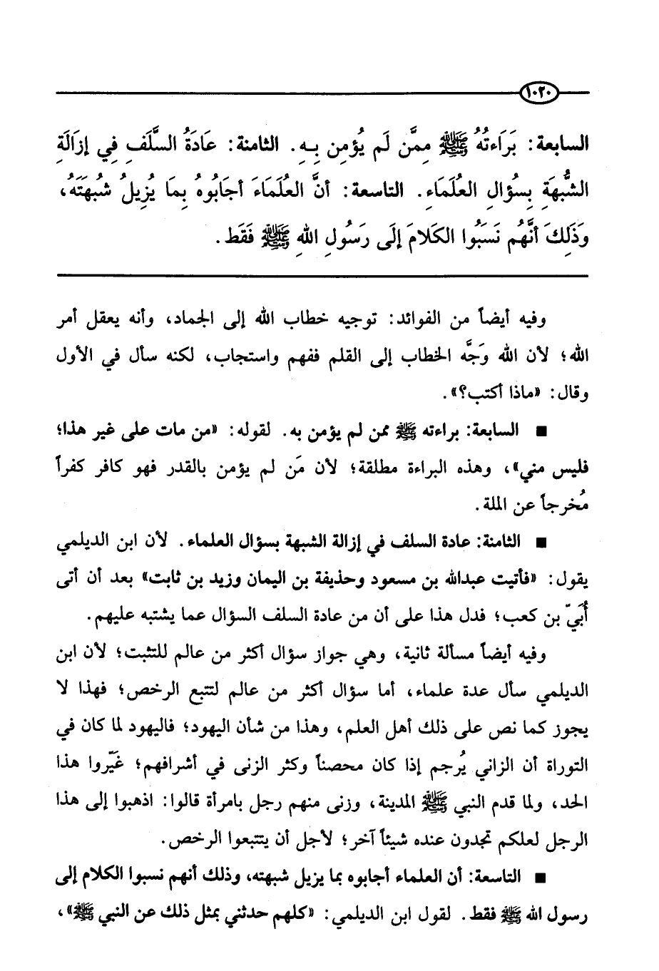 السابعة: براءته صَلَّى اللَّهُ عَلَيْهِ وَسَلَّمَ ممن لم يؤمن به. الثامنة: عادة السلف في إزالة الشبهة بسؤال العلماء. التاسعة: أن العلماء أجابوه بما يزيل شبهته، وذلك أنهم نسبوا الكلام إلى رسول الله صَلَّى اللَّهُ عَلَيْهِ وَسَلَّمَ فقط.