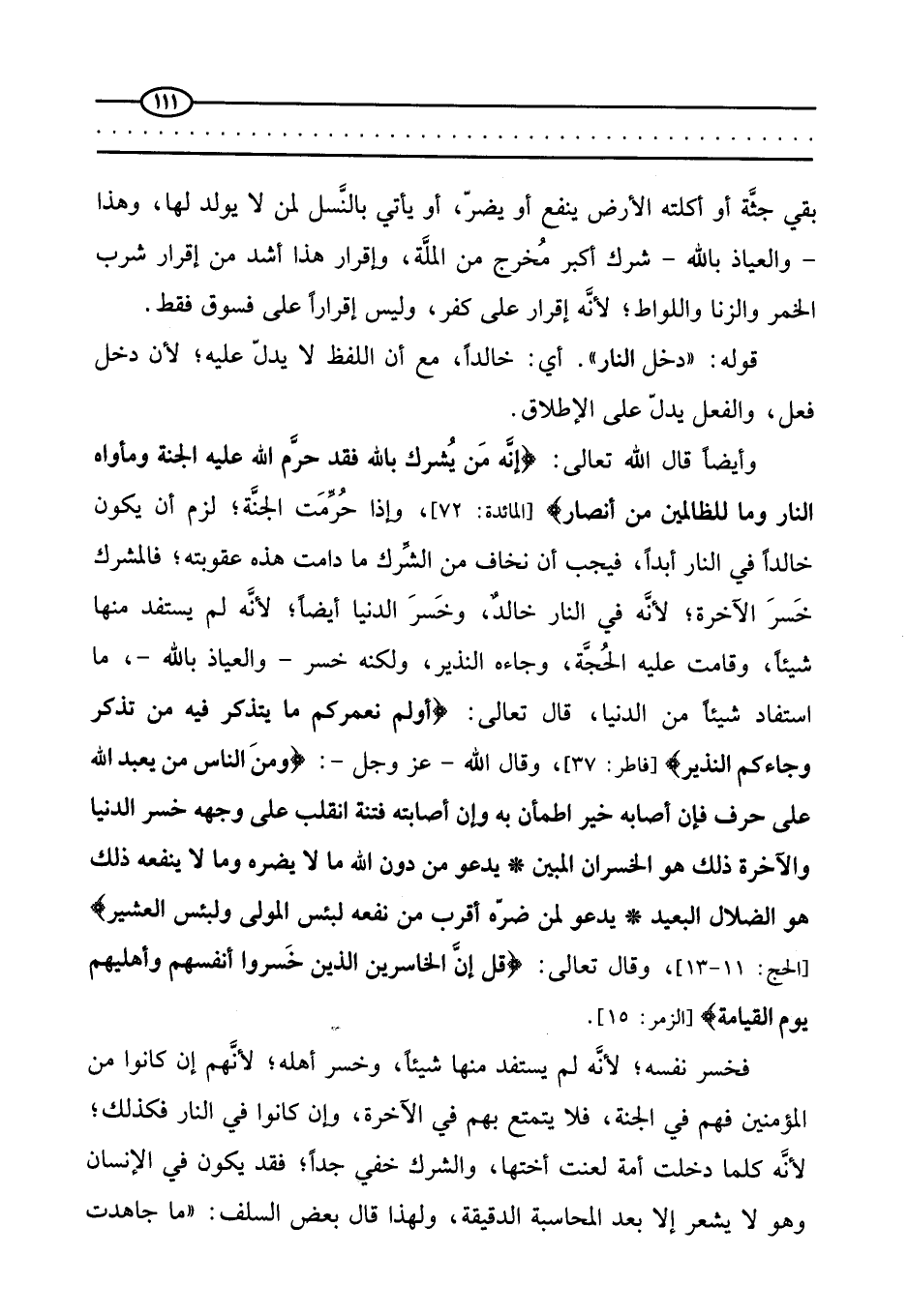الرابعة: أنه أخوف ما يخاف منه على الصالحين. الخامسة: قرب الجنة والنار. السادسة: الجمع بين قربهما في حديث واحد. السابعة: أنه من لقيه يشرك به شيئًا؛ دخل النار، ولو كان من أعبد الناس.