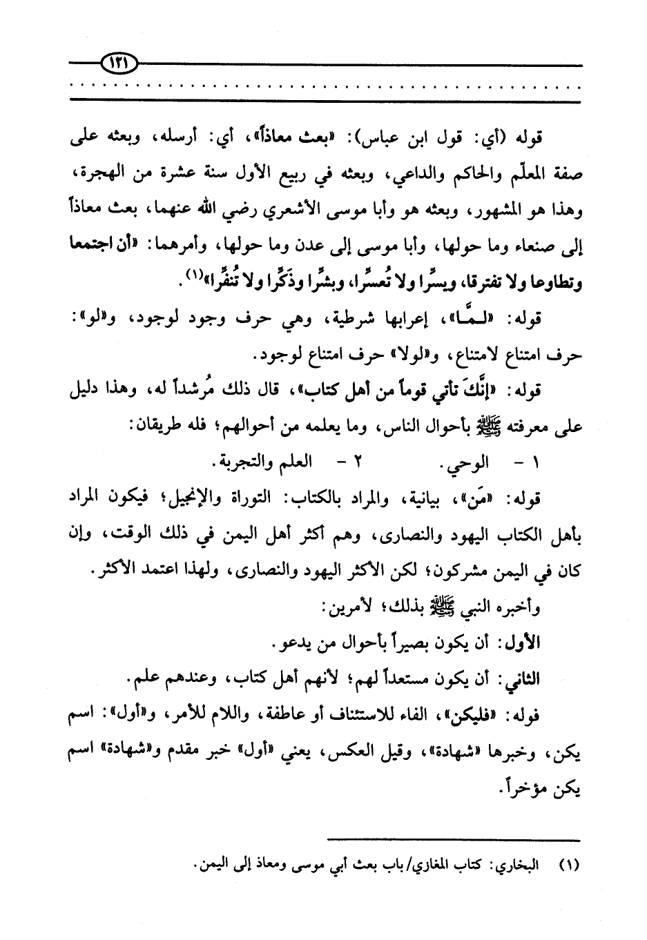 «فقال: (أين علي بن أبي طالب؟) . فقيل هو يشتكي عينيه. فأرسلوا إليه، فأتي به، فبصق في عينيه، ودعا له، فبرأ كأن لم يكن به وجع، فأعطاه الراية، فقال: (انفذ على رسلك حتى تنزل بساحتهم.»