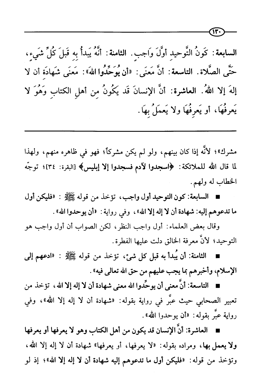 السادسة والعشرون: أنه مشروع لمن دعوا قبل ذلك وقوتلوا. السابعة والعشرون: الدعوة بالحكمة؛ لقوله: (أخبرهم بما يجب عليهم) . الثامنه والعشرون: المعرفة بحق الله في الإسلام. التاسعة والعشرون: ثواب من اهتدى على يديه رجل واحد. الثلاثون: الحلف على الفتيا.