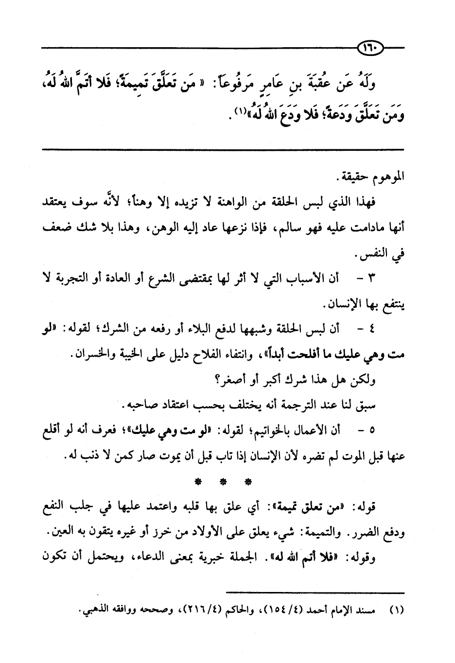 الأولى: التغليظ في لبس الحلقة والخيط ونحوهما لمثل ذلك الثانية: أن الصحابي لو مات وهي عليه؛ ما أفلح. فيه شاهد لكلام الصحابة: أن الشرك الأصغر أكبر من الكبائر.